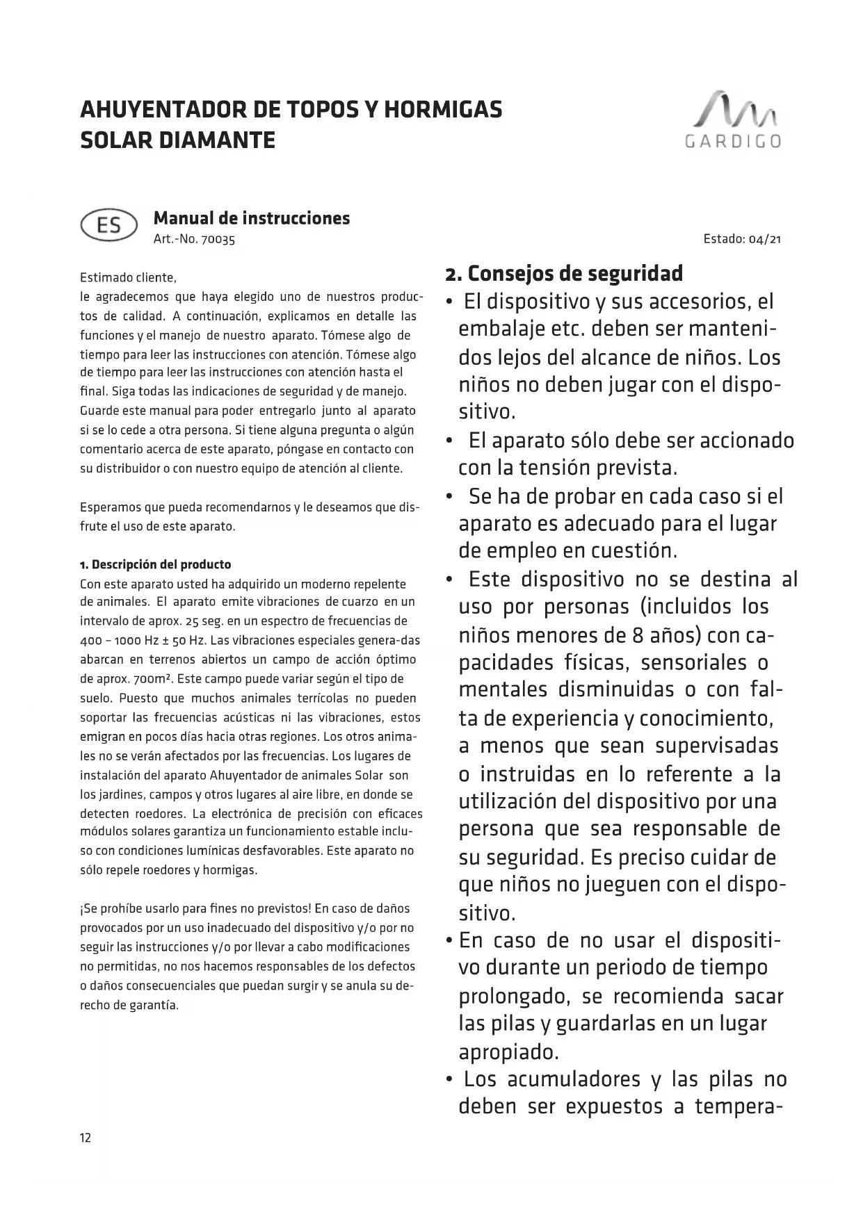 - Si el dispositivo llega a ensuciarse, límpielo con un trapo húmedo. No use limpiadores abrasivos ni disolventes. Servicio: service@gardigo.de Su Equipo Gardigo Indicaciones para la protección del medio ambiente Si es posible, retire las pilas y baterías del dispositivo antes de desecharlo y deséchelas por separado. Este producto no se pue- de tirar al cubo de basura convencional al final de su vida útil, sino que debe ser entregado en un punto de recogida para el re- ciclaje de aparatos eléctricos y electrónicos. El símbolo que apa- rece en el producto, en las instrucciones de uso o en el paquete hace referencia a esto. Los materiales son reutilizables de acuer- do con su identificación. Al reutilizar, utilizar como material o utilizar de alguna otra forma aparatos antiguos está prestando un importante servicio a la protección de nuestro medio ambien- te. Por favor, pregunte por el puesto de gestión de residuos en su administración local. Indicaciones sobre la eliminación de las pilas Las pilas/baterías están sometidas a disposiciones legales. Por ello, deberá entregarlas después de su uso en el punto de venta o en un centro de recogida de residuos perteneciente a los organis- mos públicos responsables de la gestión de los residuos. No des- eche nunca baterías o pilas en la basura doméstica, bolsas ama- rillas o similares. Las pilas o baterías sólo deben desecharse en el depósito de recogida de pilas usadas cuando estén descargadas y después de haber tomado precauciones contra cortocircuitos (p. ej. cubrir los polos). Por favor, no introduzca el dispositivo directamente en la topera y apáguelo de vez en cuando o sáquelo del suelo para evitar que los animales se acostumbren a él.15 Istruzioni per l’uso Art.-No. 70035 Gentile cliente, grazie per aver scelto uno dei nostri prodotti di alta qualità. Qui di seguito spieghiamo le funzioni e le modalità d’uso del nostro dispositivo, che vi invitiamo a leggere attentamente e a seguire scrupolosamente. Porre estrema attenzione a tutte le norme di sicurezza e di funzionamento indicate. Conser- vare queste istruzioni e consegnarle insieme all’apparecchio, nel caso in cui questo venga prestato/rivenduto. Per doman- de o suggerimenti concernenti il presente prodotto, rivolge- tevi ai rivenditori specializzati o al nostro team di assistenza. Saremo lieti se l’uso di questo dispositivo soddisferà le vostre esigenze e se consiglieresti nostri prodotti ad altri.