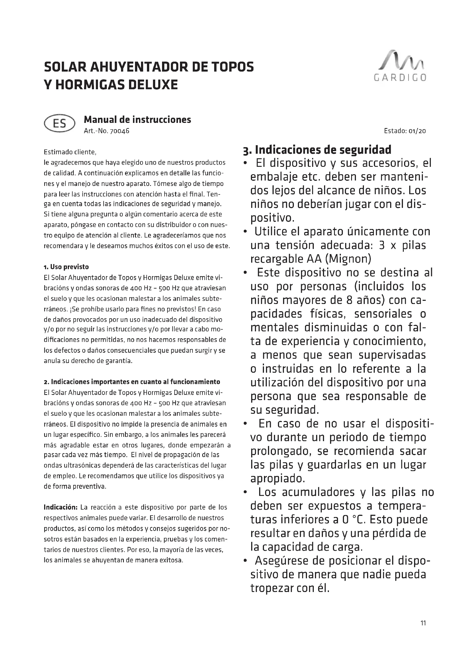 El Solar Ahuyentador de Topos y Hormigas Deluxe emite vi- bracións y ondas sonoras de 400 Hz – 500 Hz que atraviesan el suelo y que les ocasionan malestar a los animales subte- rráneos. ¡Se prohíbe usarlo para fines no previstos! En caso de daños provocados por un uso inadecuado del dispositivo y/o por no seguir las instrucciones y/o por llevar a cabo mo- dificaciones no permitidas, no nos hacemos responsables de los defectos o daños consecuenciales que puedan surgir y se anula su derecho de garantía.