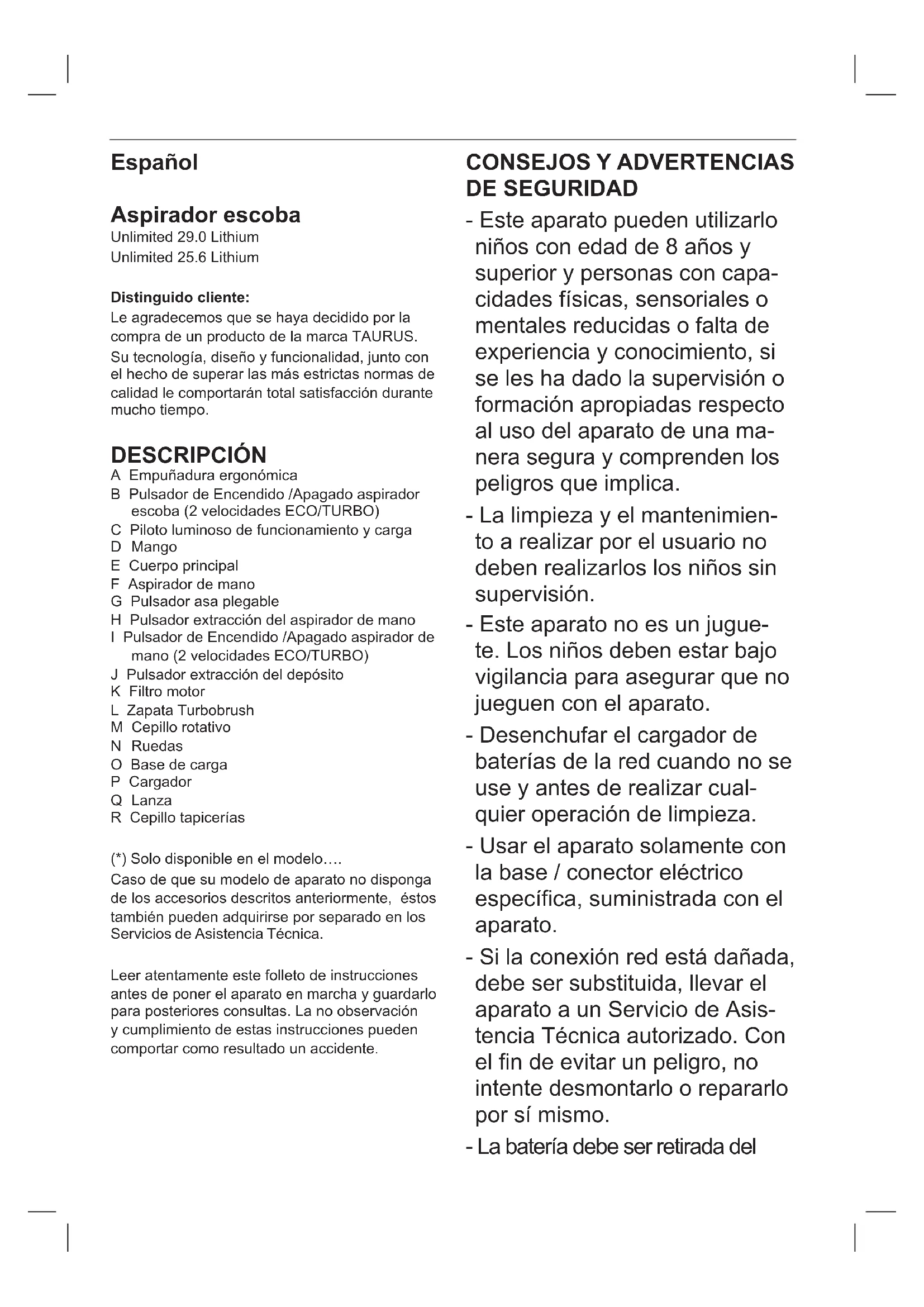 CFig.2 Fig.3 Fig.4 Fig.5 Fig.6Fig.7 Fig.8Español Aspirador escoba Unlimited 29.0 Lithium Unlimited 25.6 Lithium Distinguido cliente: Le agradecemos que se haya decidido por la compra de un producto de la marca TAURUS. Su tecnología, diseño y funcionalidad, junto con el hecho de superar las más estrictas normas de calidad le comportarán total satisfacción durante mucho tiempo. DESCRIPCIÓN A Empuñadura ergonómica B Pulsador de Encendido /Apagado aspirador escoba (2 velocidades ECO/TURBO) C Piloto luminoso de funcionamiento y carga D Mango E Cuerpo principal F Aspirador de mano G Pulsador asa plegable H Pulsador extracción del aspirador de mano I Pulsador de Encendido /Apagado aspirador de mano (2 velocidades ECO/TURBO) J Pulsador extracción del depósito K Filtro motor L Zapata Turbobrush M Cepillo rotativo N Ruedas O Base de carga P Cargador Q Lanza R Cepillo tapicerías (*) Solo disponible en el modelo…. Caso de que su modelo de aparato no disponga de los accesorios descritos anteriormente, éstos también pueden adquirirse por separado en los Servicios de Asistencia Técnica. Leer atentamente este folleto de instrucciones antes de poner el aparato en marcha y guardarlo para posteriores consultas. La no observación y cumplimiento de estas instrucciones pueden comportar como resultado un accidente.