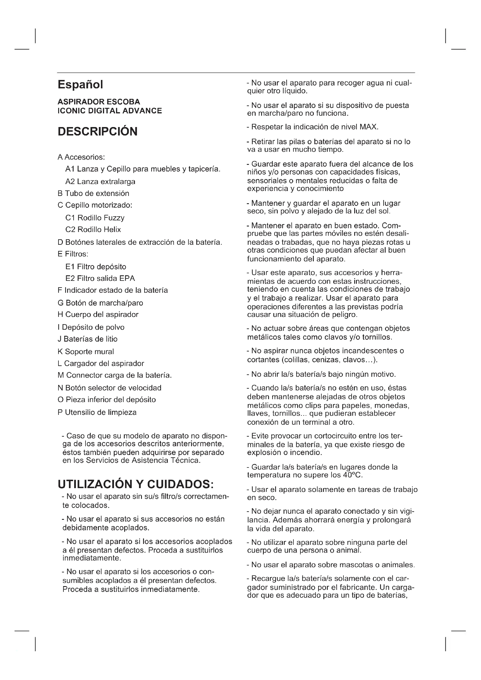 DESCRIPCIÓN A Accesorios: A1 Lanza y Cepillo para muebles y tapicería. A2 Lanza extralarga B Tubo de extensión C Cepillo motorizado: C1 Rodillo Fuzzy C2 Rodillo Helix D Botónes laterales de extracción de la batería. E Filtros: E1 Filtro depósito E2 Filtro salida EPA F Indicador estado de la batería G Botón de marcha/paro H Cuerpo del aspirador I Depósito de polvo J Baterías de litio K Soporte mural L Cargador del aspirador M Connector carga de la batería. N Botón selector de velocidad O Pieza inferior del depósito P Utensilio de limpieza - Caso de que su modelo de aparato no dispon- ga de los accesorios descritos anteriormente, éstos también pueden adquirirse por separado en los Servicios de Asistencia Técnica. UTILIZACIÓN Y CUIDADOS: - No usar el aparato sin su/s ltro/s correctamen- te colocados. - No usar el aparato si sus accesorios no están debidamente acoplados. - No usar el aparato si los accesorios acoplados a él presentan defectos. Proceda a sustituirlos inmediatamente. - No usar el aparato si los accesorios o con- sumibles acoplados a él presentan defectos. Proceda a sustituirlos inmediatamente. - No usar el aparato para recoger agua ni cual- quier otro líquido. - No usar el aparato si su dispositivo de puesta en marcha/paro no funciona. - Respetar la indicación de nivel MAX. - Retirar las pilas o baterías del aparato si no lo va a usar en mucho tiempo. - Guardar este aparato fuera del alcance de los niños y/o personas con capacidades físicas, sensoriales o mentales reducidas o falta de experiencia y conocimiento - Mantener y guardar el aparato en un lugar seco, sin polvo y alejado de la luz del sol. - Mantener el aparato en buen estado. Com- pruebe que las partes móviles no estén desali- neadas o trabadas, que no haya piezas rotas u otras condiciones que puedan afectar al buen funcionamiento del aparato. - Usar este aparato, sus accesorios y herra- mientas de acuerdo con estas instrucciones, teniendo en cuenta las condiciones de trabajo y el trabajo a realizar. Usar el aparato para operaciones diferentes a las previstas podría causar una situación de peligro. - No actuar sobre áreas que contengan objetos metálicos tales como clavos y/o tornillos. - No aspirar nunca objetos incandescentes o cortantes (colillas, cenizas, clavos…). - No abrir la/s batería/s bajo ningún motivo. - Cuando la/s batería/s no estén en uso, éstas deben mantenerse alejadas de otros objetos metálicos como clips para papeles, monedas, llaves, tornillos... que pudieran establecer conexión de un terminal a otro. - Evite provocar un cortocircuito entre los ter- minales de la batería, ya que existe riesgo de explosión o incendio. - Guardar la/s batería/s en lugares donde la temperatura no supere los 40ºC. - Usar el aparato solamente en tareas de trabajo en seco. - No dejar nunca el aparato conectado y sin vigi- lancia. Además ahorrará energía y prolongará la vida del aparato. - No utilizar el aparato sobre ninguna parte del cuerpo de una persona o animal. - No usar el aparato sobre mascotas o animales. - Recargue la/s batería/s solamente con el car- gador suministrado por el fabricante. Un carga- dor que es adecuado para un tipo de baterías,- Si solo se ilumina un piloto signica que la batería dispone de poca carga. - Si no se ilumina ningún piloto, signica que la batería está totalmente descargada. Nota: Para una óptima vida de la batería, se recomienda solo cargar la batería cuando se encuentre totalmente descargada.