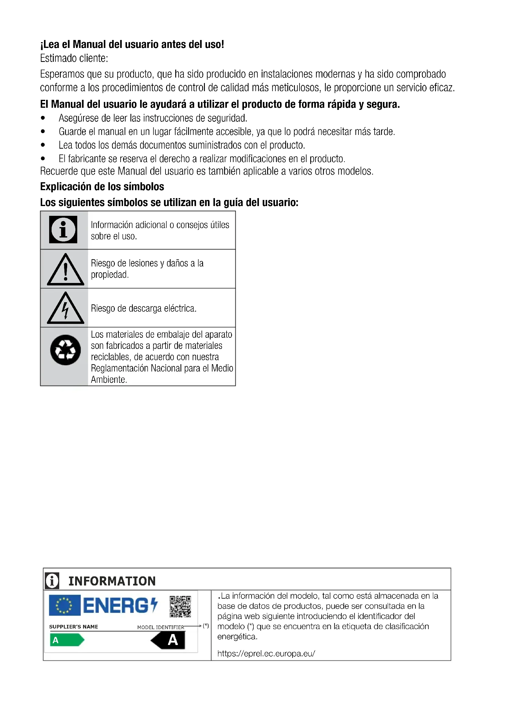 Información adicional o consejos útiles sobre el uso. Riesgo de lesiones y daños a la propiedad. Riesgo de descarga eléctrica.Los materiales de embalaje del aparato son fabricados a partir de materiales reciclables, de acuerdo con nuestra Reglamentación Nacional para el Medio Ambiente. .La información del modelo, tal como está almacenada en la base de datos de productos, puede ser consultada en la página web siguiente introduciendo el identificador del modelo (*) que se encuentra en la etiqueta de clasificación energética.https://eprel.ec.europa.eu/