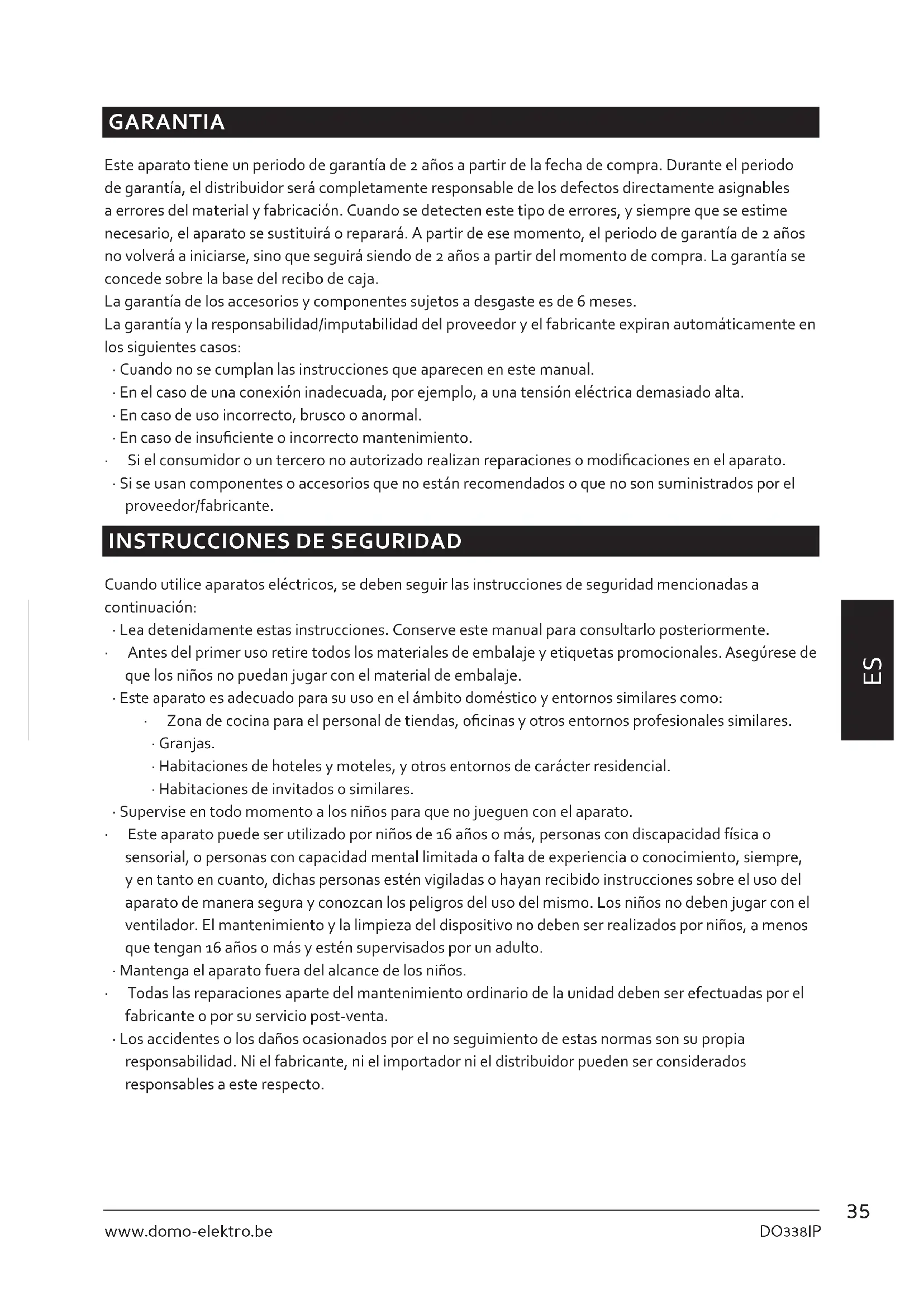 - Los accidentes o los daños ocasionados por el no seguimiento de estas normas son su propia responsabilidad. Ni el fabricante, ni el importador ni el distribuidor pueden ser considerados responsables a este respecto.36 DO338IP