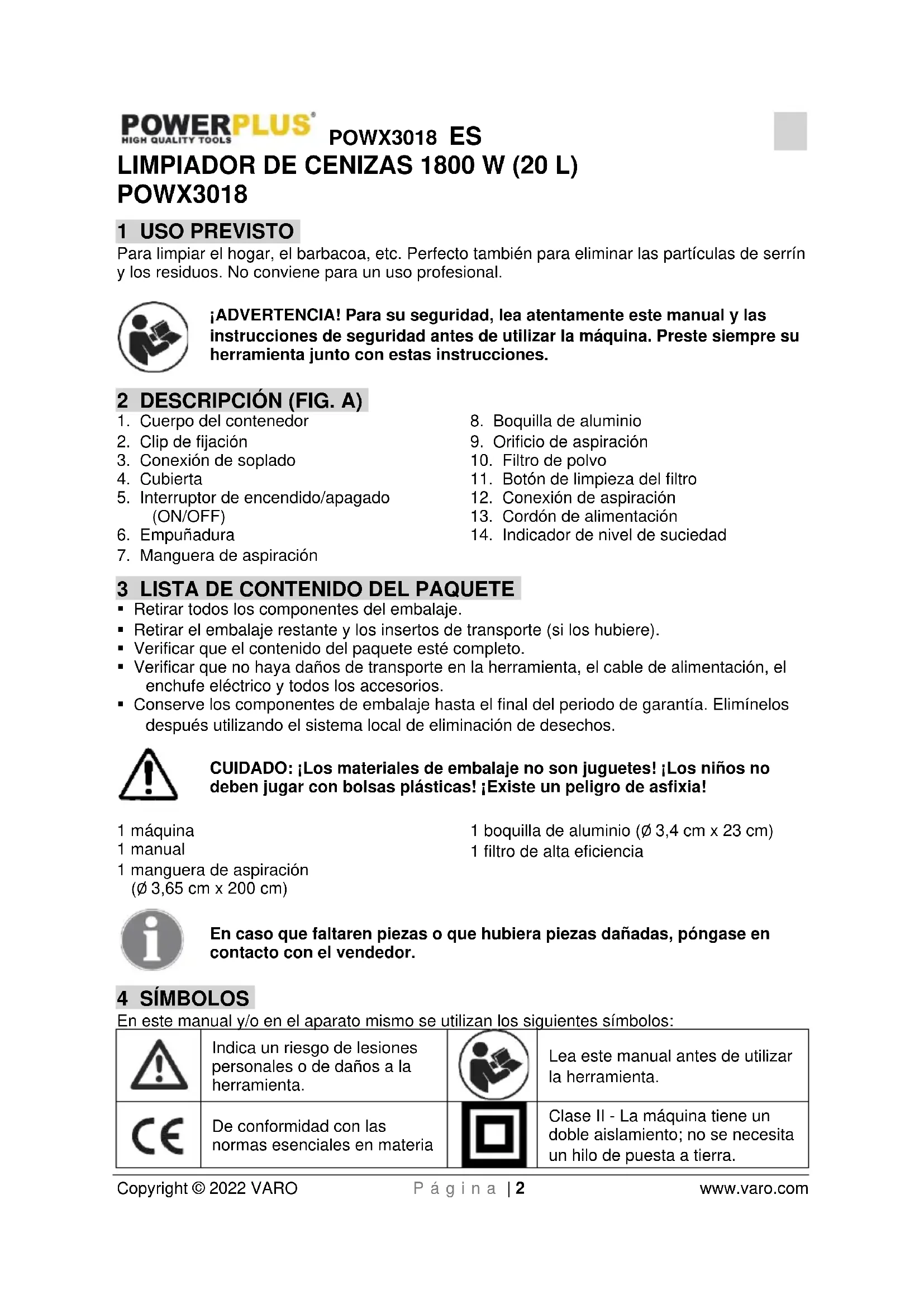Copyright © 2022 VARO P á g i n a | 2 www.varo.com LIMPIADOR DE CENIZAS 1800 W (20 L) POWX3018 1 USO PREVISTO Para limpiar el hogar, el barbacoa, etc. Perfecto también para eliminar las partículas de serrín y los residuos. No conviene para un uso profesional. ¡ADVERTENCIA! Para su seguridad, lea atentamente este manual y las instrucciones de seguridad antes de utilizar la máquina. Preste siempre su herramienta junto con estas instrucciones. 2 DESCRIPCIÓN (FIG. A)