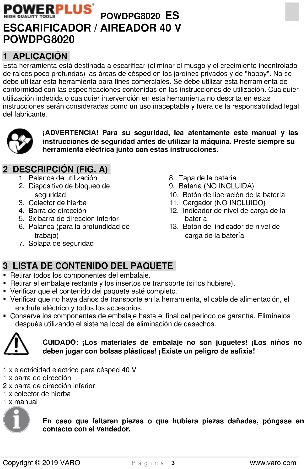 - Conserve los componentes de embalaje hasta el final del periodo de garantía. Elimínelos después utilizando el sistema local de eliminación de desechos. CUIDADO: ¡Los materiales de embalaje no son juguetes! ¡Los niños no deben jugar con bolsas plásticas! ¡Existe un peligro de asfixia! 1 x electricidad eléctrico para césped 40 V 1 x barra de dirección 2 x barra de dirección inferior 1 x colector de hierba 1 x manual En caso que faltaren piezas o que hubiera piezas dañadas, póngase en contacto con el vendedor.POWDPG8020 ES Copyright © 2019 VARO P á g i n a | 4 www.varo.com 4 SÍMBOLOS En este manual y/o en el aparato mismo se utilizan los siguientes símbolos:
