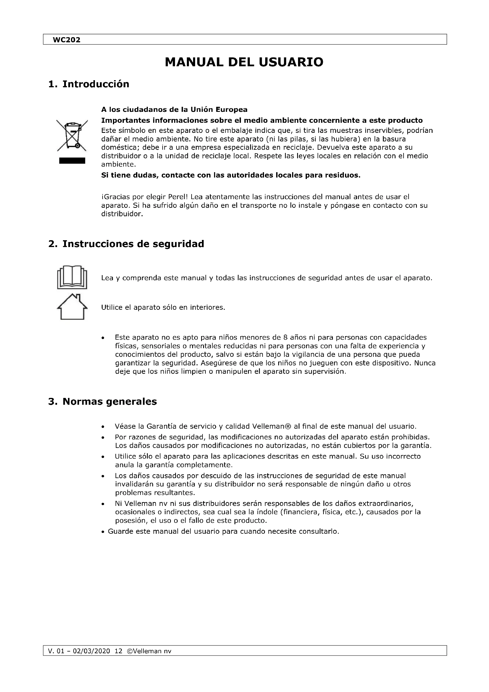 Velleman NV dispone de los derechos de autor para este manual del usuario. Todos los derechos mundiales reservados. Está estrictamente prohibido reproducir, traducir, copiar, editar y guardar este manual del usuario o partes de ello sin el consentimiento previo por escrito del propietario del copyright.WC202