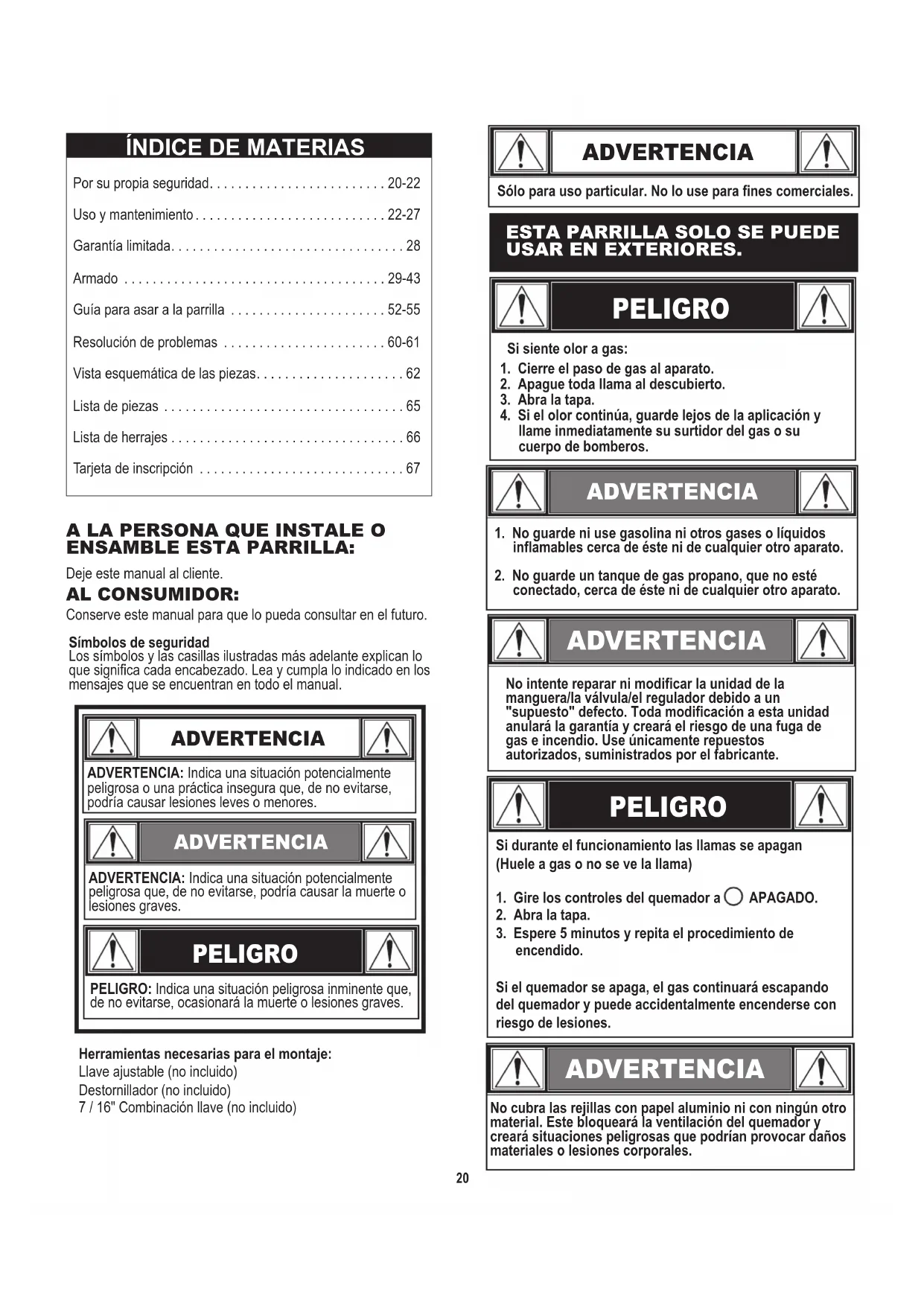 - Tarjeta de inscripción Herramientas necesarias para el montaje:Llave ajustable (no incluido)Destornillador (no incluido)7 / 16" Combinación llave (no incluido)21 Antes de empezar a ensamblar la parrilla y cocinar, lea y siga todas las indicaciones de seguridad, las instrucciones de ensamblado y las instrucciones de uso y de cuidado Ciertas pueden tener bordes cortantes. Si es necesario, use guantes protectores. ADVERTENCIA PROPOSICION 65 DEL ESTADO DE CALIFORNIA 1. En el estado de California se sabe que los subproductos de la combustión, que se producen al usar este producto, contienen substancias químicas que causan cáncer, defectos congénitos u otras lesiones al aparato reproductor.2. Este producto contiene substancias químicas, incluyendo el plomo y compuestos de plomo, que en el estado de California se sabe que las causan cáncer, defectos congénitos u otras lesiones al aparato reproductor.Lávese las manos después de manipular este PELIGRO ADVERTENCIAFuego de Grasa• No es posible apagar los fuegos provocados por la grasa cerrando la tapa. Por razones de seguridad, las parrillas tienen aberturas de ventilación. • No use agua para apagar los fuegos provocados por la grasa. Esto puede ocasionar lesiones. Si surge un fuego provocado por la grasa, cierre las perillas y el tanque de gas. • Si el asador no se ha limpiado regularmente, podría ocurrir fuego causado por la grasa que podría dañar el producto. Preste mucha atención mientras precalienta o quema los residuos de comida para asegurar que no se cause fuego debido a la grasa. PELIGRO ADVERTENCIAEl uso de macetas de más de 6 cuartos de la capacidad podría superar límite de peso de lado el quemador plataforma o lado plataforma lo que resulta en el fracaso de la parrilla carrito componentes. PELIGRO ADVERTENCIA PELIGRO ADVERTENCIA PELIGRO ADVERTENCIAEl no cumplir con todas instrucciones del fabricante puede ocasionar graves y/o daños materials.• NUNCA guarde los cilindros de gas de repuesto debajo del aparato, cerca del mismo, ni en áreas cerradas. • Nunca cargue el tanque con más del 80% de su capacidad.• Los tanques de gas propano de repuesto sobrecargados o mal llenados son peligrosos, ya que la válvula de seguridad puede dejar salir gas. Esto puede provocar incendios intensos que pueden causar daños materiales, lesiones graves o la muerte.• Si observa, huele o escucha una fuga de gas, aléjese de inmediato del cilindro y del aparato, y llame a los bomberos.• La mejor forma de prevenir el incendio de grasas es limpiar frecuentemente la parrilla siguiendo las instrucciones de Limpieza general de la parrilla y Limpieza del conjunto quemador.22 p. 67
