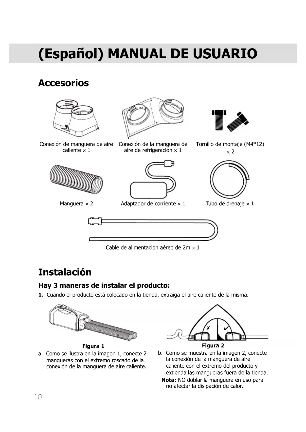 Figura 1 a. Como se ilustra en la imagen 1, conecte 2 mangueras con el extremo roscado de la conexión de la manguera de aire caliente. Figura 2 b. Como se muestra en la imagen 2, conecte la conexión de la manguera de aire caliente con el extremo del producto y extienda las mangueras fuera de la tienda. Nota: NO doblar la manguera en uso para no afectar la disipación de calor.11 Figura 3
