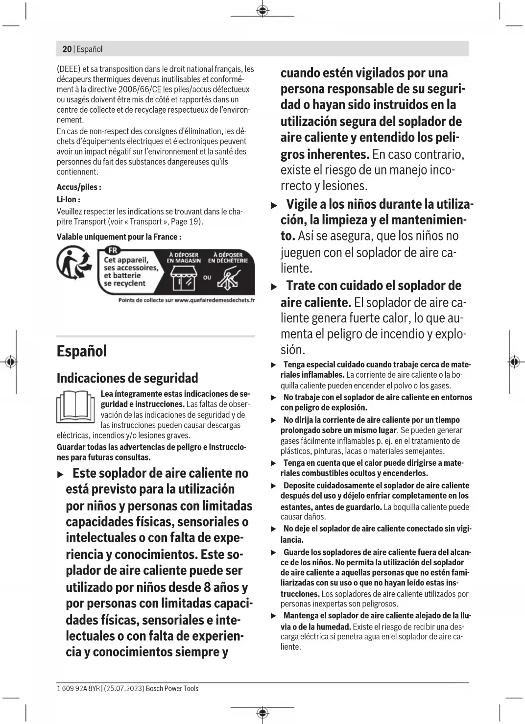 Acumulador Bosch también vende sopladores de aire caliente acciona- dos por acumulador sin acumulador. En el embalaje puede ver si un acumulador está incluido en el volumen de suminis- tro de su soplador de aire caliente. Carga del acumulador u Utilice únicamente los cargadores que se enumeran en los datos técnicos. Solamente estos cargadores han sido especialmente adaptados a los acumuladores de io- nes de litio empleados en su soplador de aire caliente. Indicación: Los acumuladores de iones de litio se entregan parcialmente cargados debido a la normativa de transporte internacional. Con el fin de obtener la plena potencia del acumulador, cargue completamente el acumulador antes de su primer uso. Montaje del acumulador u Coloque el acumulador sin ejercer fuerza. El acumula- dor se ha construido de tal manera, que sólo se puede in- troducir en la posición correcta en el soplador de aire ca- liente. Desplace el acumulador cargado en el alojamiento del acu- mulador, hasta que encastre perceptible. El acumulador de iones de litio está protegido contra descar- ga total gracias al sistema de protección electrónica de cel- das "Electronic Cell Protection (ECP)". Si el acumulador está descargado, un circuito protector se encarga de desconec- tar el soplador de aire caliente. Desmontaje del acumulador Para la extracción del acumulador, presione la tecla de de- senclavamiento y retire el acumulador. No proceda con brusquedad. Indicador del estado de carga del acumulador Indicación: No cada tipo de acumulador dispone de un indi- cador de estado de carga. Los LEDs verdes del indicador del estado de carga del acu- mulador indican el estado de carga del acumulador. Por mo- tivos de seguridad, la consulta del estado de carga es solo posible con el soplador de aire caliente inactivo. Presione la tecla del indicador de estado de carga o , para indicar el estado de carga. Esto también es posible con el acumulador desmontado. Si tras presionar la tecla del indicador de estado de carga no se enciende ningún LED, significa que el acumulador está defectuoso y debe sustituirse. Tipo de acumulador GBA18V... Diodo luminoso (LED) Capacidad Luz permanente 3× verde 60–100% Luz permanente 2× verde 30–60% Luz permanente 1× verde 5–30% Luz intermitente 1× verde 0–5% Tipo de acumulador ProCORE18V... Diodo luminoso (LED) Capacidad Luz permanente 5× verde 80–100% Luz permanente 4× verde 60–80% Luz permanente 3× verde 40–60% Luz permanente 2× verde 20–40% Luz permanente 1× verde 5–20% Luz intermitente 1× verde 0–5% Indicaciones para el trato óptimo del acumulador Proteja el acumulador de la humedad y del agua. Únicamente almacene el acumulador en el margen de tem- peratura desde −20°C hasta 50°C. P.ej., no deje el acumu- lador en el coche en verano. 1 609 92A 8YR | (25.07.2023) Bosch Power ToolsEspañol | 23 Limpie de vez en cuando las rejillas de refrigeración del acu- mulador con un pincel suave, limpio y seco. Si después de una recarga, el tiempo de funcionamiento del acumulador fuese muy reducido, ello es señal de que éste está agotado y deberá sustituirse. Observe las indicaciones referentes a la eliminación. Operación Puesta en marcha u Retire el acumulador antes de cambiar accesorios o guardar el soplador de aire caliente. Esta medida pre- ventiva evita el riesgo de conexión accidental del sopla- dor de aire caliente. Generación de humo en la primera puesta en servicio Las superficies metálicas están protegidas contra la corro- sión con un revestimiento de fábrica. Esta capa protectora se evapora en la primera puesta en servicio. Debido al proceso de fabricación, el soplador de aire calien- te puede presentar decoloraciones en la boquilla(1). En es- te caso no se trata de daños, la función del soplador de aire caliente no se ve afectada. Seleccionar el nivel de potencia Con el ajuste del nivel de potencia(3) puede elegir entre 2 niveles de potencia diferentes. Al conmutar, la luz de trabajo LED parpadea brevemente: – Nivel de 300°C Con este nivel puede p. ej. descongelar tuberías de agua o tratar tubos flexible termocontráctiles. Tras la conexión, la temperatura se alcanza en menos de 6s. Con un acu- mulador de 8 Ah completamente cargado, el tiempo de funcionamiento es de hasta 21min. – Nivel de 500°C Con este nivel puede p. ej. decapar pinturas. Las indicaciones sobre el tiempo de calentamiento se refie- ren a mediciones a temperatura ambiente. Conexión Para conectar, presione primero el interruptor de desblo- queo (4) y luego el interruptor de conexión/desconexión (5). Tras el arranque puede soltar el interruptor de desblo- queo (4); el interruptor de desbloqueo (4) no se necesita se- guir presionando durante el funcionamiento. Al arrancar el soplador de aire caliente, la luz de trabajo LED(6) se enciende e ilumina la zona de trabajo. Desconexión Para la desconexión suelte el interruptor de conexión/ desconexión(5). Coloque el soplador de aire caliente sobre el acumulador(8), para dejar que se enfríe. Protección contra rearranque Si se retira el acumulador(8) del soplador de aire caliente durante el funcionamiento y se vuelve a colocar mientras el interruptor de conexión/desconexión(5) sigue presionado, se activa la protección contra rearranque. La luz de trabajo LED(6) parpadea y el soplador de aire caliente no se pone en marcha. Suelte el interruptor de conexión/desconexión(5) y conecte luego el soplador de aire caliente como de costumbre. Protección contra sobrecalentamiento para el acumulador Si el acumulador(8) se calienta demasiado durante el fun- cionamiento, se reduce la potencia. La luz de trabajo LED(6) parpadea lentamente mientras el interruptor de co- nexión/desconexión(5) está pulsado. Si el soplador de aire caliente se sigue utilizando y la tempe- ratura de la batería sigue aumentando, el soplador de aire caliente se autodesconecta. Potencia reducida El soplador de aire caliente es compatible con todos 