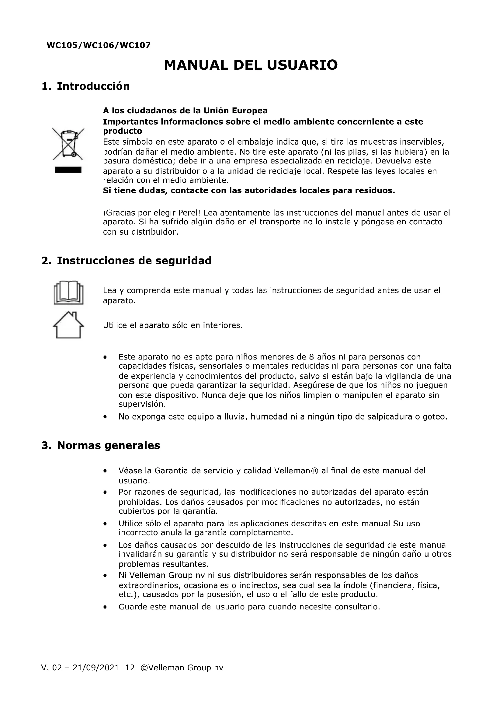Velleman Group nv dispone de los derechos de autor para este manual del usuario. Todos los derechos mundiales reservados. Está estrictamente prohibido reproducir, traducir, copiar, editar y guardar este manual del usuario o partes de ello sin el consentimiento previo por escrito del propietario del copyright.WC105/WC106/WC107