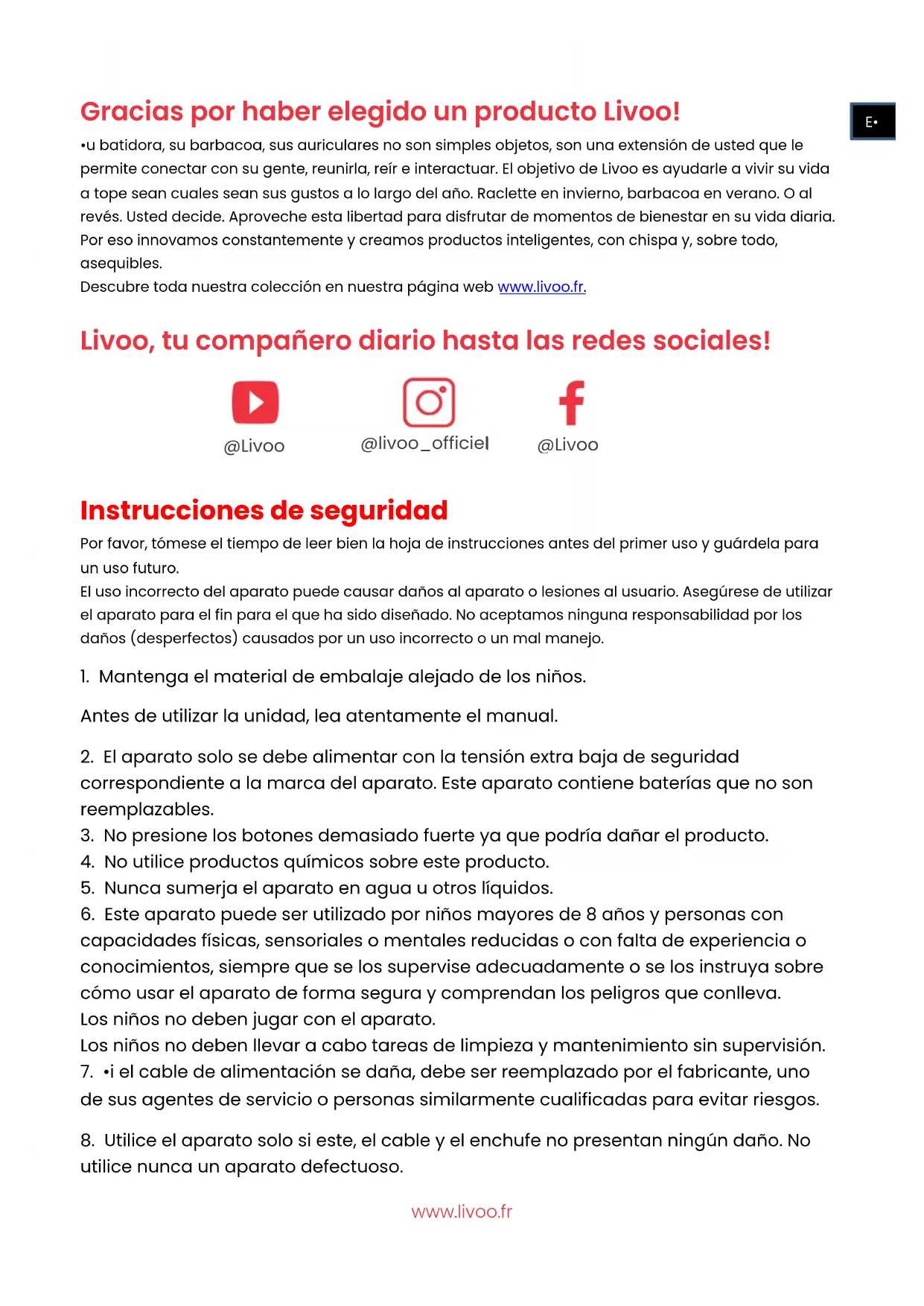 ENwww.livoo.fr Gracias por haber elegido un producto Livoo! Su batidora, su barbacoa, sus auriculares no son simples objetos, son una extensión de usted que le permite conectar con su gente, reunirla, reír e interactuar. El objetivo de Livoo es ayudarle a vivir su vida a tope sean cuales sean sus gustos a lo largo del año. Raclette en invierno, barbacoa en verano. O al revés. Usted decide. Aproveche esta libertad para disfrutar de momentos de bienestar en su vida diaria. Por eso innovamos constantemente y creamos productos inteligentes, con chispa y, sobre todo, asequibles. Descubre toda nuestra colección en nuestra página web www.livoo.fr. Livoo, tu compañero diario hasta las redes sociales!