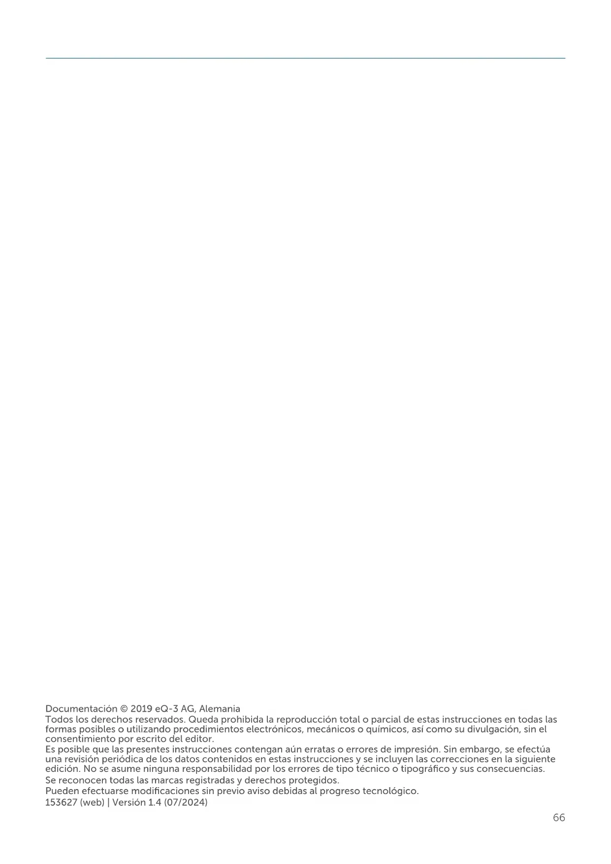 12 Restablecimiento de la configuración de fábrica 84 13 Mantenimiento y limpieza ........................................................................ 84 14 Indicaciones generales sobre el modo inalámbrico 84 15 Eliminación .................................................................................................. 85 16 Datos técnicos ............................................................................................ 8666 Documentación © 2019 eQ-3 AG, Alemania Todos los derechos reservados. Queda prohibida la reproducción total o parcial de estas instrucciones en todas las formas posibles o utilizando procedimientos electrónicos, mecánicos o químicos, así como su divulgación, sin el consentimiento por escrito del editor. Es posible que las presentes instrucciones contengan aún erratas o errores de impresión. Sin embargo, se efectúa una revisión periódica de los datos contenidos en estas instrucciones y se incluyen las correcciones en la siguiente edición. No se asume ninguna responsabilidad por los errores de tipo técnico o tipográfico y sus consecuencias. Se reconocen todas las marcas registradas y derechos protegidos. Pueden efectuarse modificaciones sin previo aviso debidas al progreso tecnológico. 153627 (web) | Versión 1.4 (07/2024)67 Volumen de suministro 1 Volumen de suministro