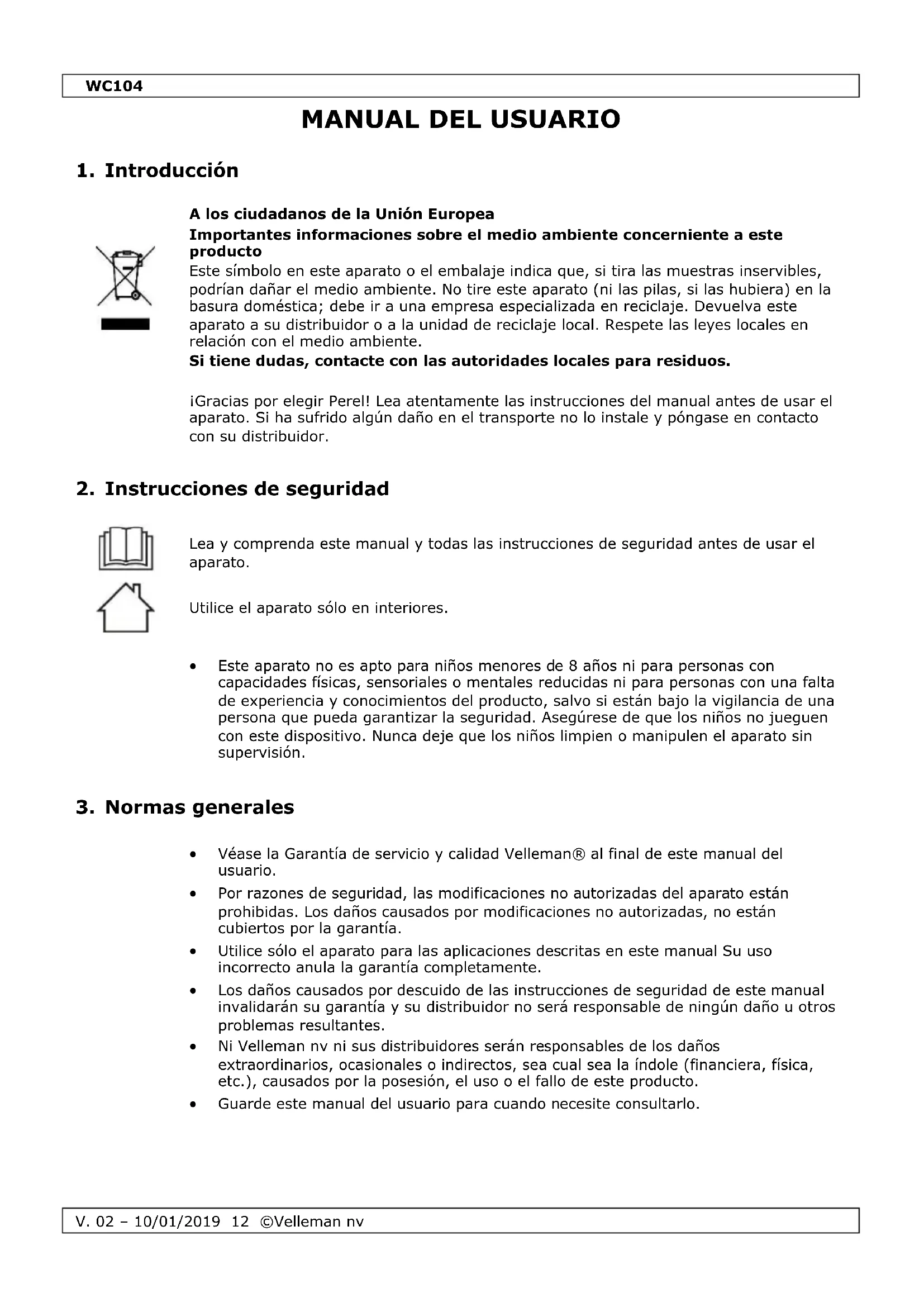 Velleman NV dispone de los derechos de autor para este manual del usuario. Todos los derechos mundiales reservados. Está estrictamente prohibido reproducir, traducir, copiar, editar y guardar este manual del usuario o partes de ello sin el consentimiento previo por escrito del propietario del copyright.WC104