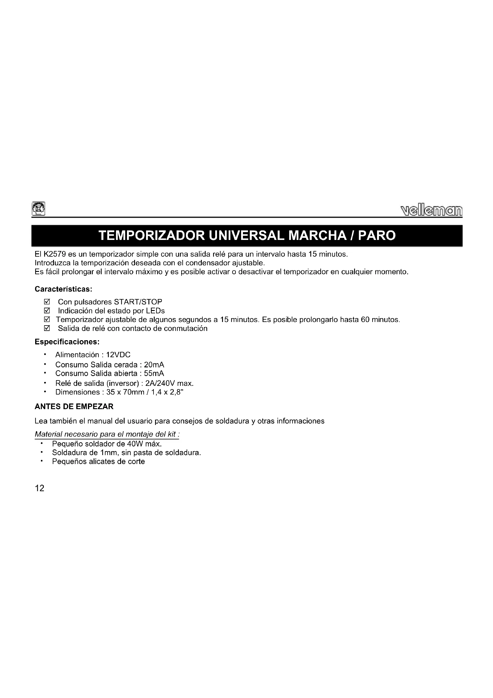 Encuentra gratis el manual del aparato K2579 VELLEMAN en formato PDF.