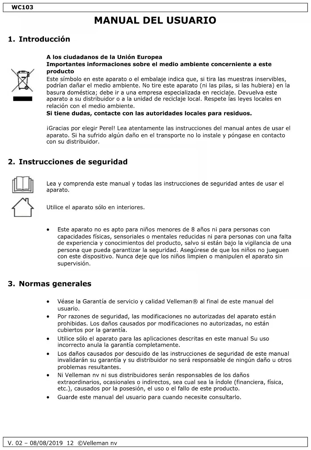Velleman NV dispone de los derechos de autor para este manual del usuario. Todos los derechos mundiales reservados. Está estrictamente prohibido reproducir, traducir, copiar, editar y guardar este manual del usuario o partes de ello sin el consentimiento previo por escrito del propietario del copyright.WC103
