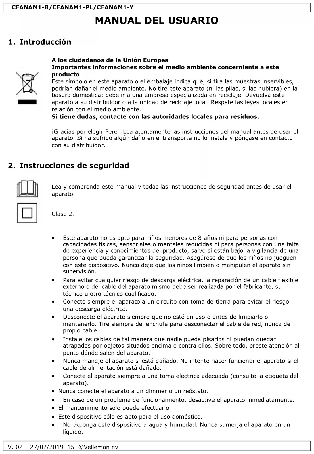 Velleman NV dispone de los derechos de autor para este manual del usuario. Todos los derechos mundiales reservados. Está estrictamente prohibido reproducir, traducir, copiar, editar y guardar este manual del usuario o partes de ello sin el consentimiento previo por escrito del propietario del copyright.CFANAM1-B/CFANAM1-PL/CFANAM1-Y
