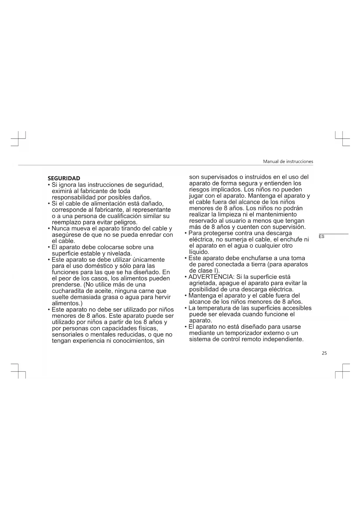- Este aparato no debe ser utilizado por niños menores de 8 años. Este aparato puede ser utilizado por niños a partir de los 8 años y por personas con capacidades físicas, sensoriales o mentales reducidas, o que no tengan experiencia ni conocimientos, sin son supervisados o instruidos en el uso del aparato de forma segura y entienden los riesgos implicados. Los niños no pueden jugar con el aparato. Mantenga el aparato y el cable fuera del alcance de los niños menores de 8 años. Los niños no podrán realizar la limpieza ni el mantenimiento reservado al usuario a menos que tengan más de 8 años y cuenten con supervisión.