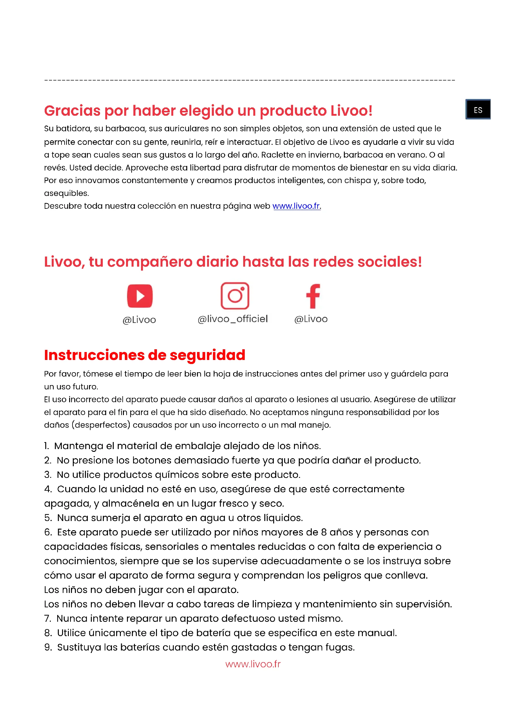 Gracias por haber elegido un producto Livoo! Su batidora, su barbacoa, sus auriculares no son simples objetos, son una extensión de usted que le permite conectar con su gente, reunirla, reír e interactuar. El objetivo de Livoo es ayudarle a vivir su vida a tope sean cuales sean sus gustos a lo largo del año. Raclette en invierno, barbacoa en verano. O al revés. Usted decide. Aproveche esta libertad para disfrutar de momentos de bienestar en su vida diaria. Por eso innovamos constantemente y creamos productos inteligentes, con chispa y, sobre todo, asequibles. Descubre toda nuestra colección en nuestra página web www.livoo.fr.