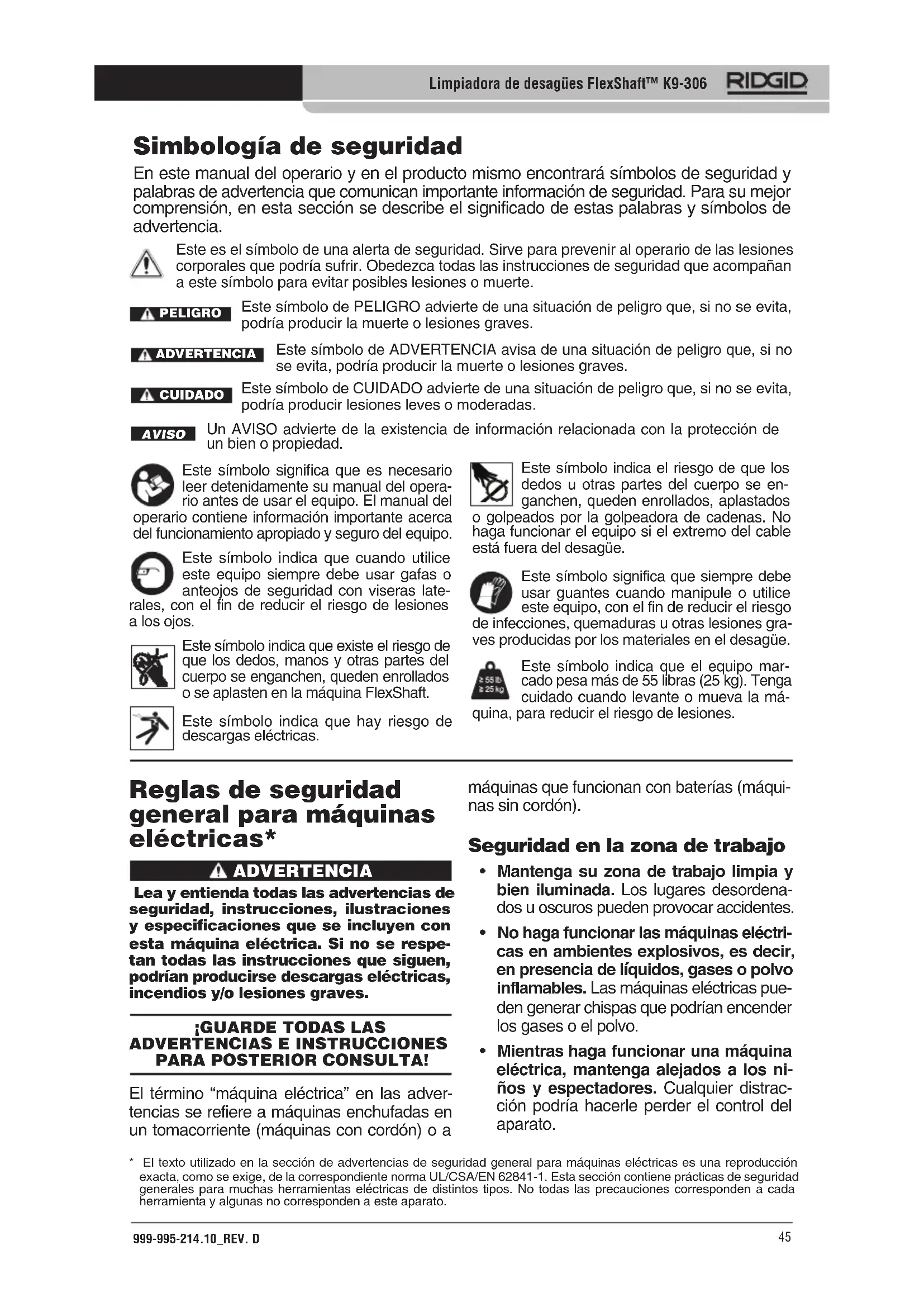 PARA POSTERIOR CONSULTA! El término “máquina eléctrica” en las adver- tencias se refiere a máquinas enchufadas en un tomacorriente (máquinas con cordón) o a AVISO PELIGRO ADVERTENCIA CUIDADOEste símbolo significa que es necesario leer detenidamente su manual del opera-rio antes de usar el equipo. El manual del operario contiene información importante acerca del funcionamiento apropiado y seguro del equipo.Este símbolo indica que cuando utilice este equipo siempre debe usar gafas o anteojos de seguridad con viseras late-rales, con el fin de reducir el riesgo de lesiones a los ojos. Este símbolo indica que hay riesgo de descargas eléctricas.Este símbolo indica el riesgo de que los dedos u otras partes del cuerpo se en-ganchen, queden enrollados, aplastados o golpeados por la golpeadora de cadenas. No haga funcionar el equipo si el extremo del cable está fuera del desagüe.Este símbolo significa que siempre debe usar guantes cuando manipule o utilice este equipo, con el fin de reducir el riesgo de infecciones, quemaduras u otras lesiones gra-ves producidas por los materiales en el desagüe.Este símbolo indica que el equipo mar-cado pesa más de 55 libras (25 kg). Tenga cuidado cuando levante o mueva la má-quina, para reducir el riesgo de lesiones.* El texto utilizado en la sección de advertencias de seguridad general para máquinas eléctricas es una reproducción exacta, como se exige, de la correspondiente norma UL/CSA/EN 62841-1. Esta sección contiene prácticas de seguridad generales para muchas herramientas eléctricas de distintos tipos. No todas las precauciones corresponden a cada herramienta y algunas no corresponden a este aparato.Limpiadora de desagües FlexShaft™ K9-306