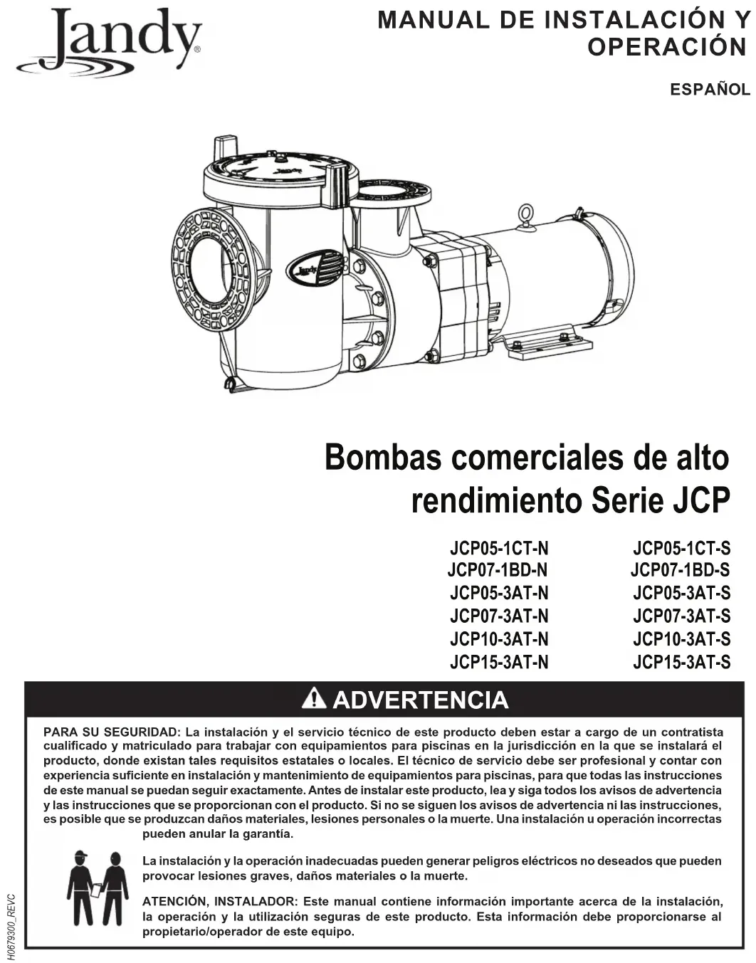 Sección 11. Datos técnicos ............................ 103Página 75 ESPAÑOL Jandy JCP Series High Performance Commercial Pumps Manual de instalación y operación ADVERTENCIA PELIGRO DE ATRAPAMIENTO POR SUCCIÓN QUE, SI NO SE EVITA, PUEDE PROVOCAR LESIONES GRAVES O LA MUERTE. No bloquee la succión de la bomba, ya que esto puede provocar lesiones graves o la muerte. No use esta bomba para piscinas infantiles, piscinas de poca profundidad o hidromasajes que contengan drenajes en el fondo, a menos que la bomba esté conectada a por lo menos a dos (2) salidas de succión en funcionamiento. Los conjuntos de salida (drenaje) de succión y sus cubiertas deben estar certificados según la edición publicada más recientemente de ANSI /ASME A112.19.8o su norma sucesora, ANSI/APSP-16. ADVERTENCIA Para reducir el riesgo de lesiones, no permita que niños ni personas con capacidades físicas, sensoriales o mentales reducidas, o sin experiencia, usen este producto. ADVERTENCIA Para reducir el riesgo de daños materiales o lesiones, no intente cambiar la posición de la válvula con la bomba en funcionamiento. ADVERTENCIA Las bombas Jandy están impulsadas por un motor eléctrico de alto voltaje y deben ser instaladas por un electricista matriculado o certificado o por un técnico de servicio de piscinas cualificado. ADVERTENCIA Debido al posible riesgo de incendios, descargas eléctricas o lesiones personales, las bombas Jandy deben instalarse en conformidad con National Electrical Code (NEC ), todos los códigos eléctricos y de seguridad locales y la Ley de Seguridad y Salud Ocupacionales (Occupational Safety and Health Act, OSHA). Es posible pedir ejemplares de NEC a National Fire Protection Association, 1 Batterymarch Park, Quincy, MA 02169, o a su organismo gubernamental de inspección local. ADVERTENCIA RIESGO DE DESCARGAS ELÉCTRICAS, INCENDIOS, LESIONES PERSONALES O MUERTE. (Para todas las unidades instaladas de manera permanente previstas para utilización a 15 o 20 amperes, ramales monofásicos de 120 a 240 voltios). Conecte solamente a un ramal que esté protegido contra falla a tierra con un interruptor para protección personal (GFCI). Contacte a un electricista autorizado si no puede verificar que el circuito está protegido por un GFCI. El instalador debe proporcionar un GFCI, que debe probarse con frecuencia. Para probar el GFCI, presione el botón de prueba. El GFCI debe interrumpir la energía. Presione el botón Reset (Restablecer). La energía debe restablecerse. Si el GFCI no funciona de esta forma, significa que tiene algún defecto. Si el GFCI interrumpe la alimentación a la bomba sin que se presione el botón de prueba, significa que hay corriente de tierra, lo que a su vez indica la posibilidad de descarga eléctrica. No utilice el dispositivo. Desconecte el dispositivo y solicite a un representante de servicio cualificado que solucione el problema antes de utilizarlo. ADVERTENCIA Un equipo instalado incorrectamente puede fallar y provocar lesiones graves, daños materiales o la muerte. Sección 1. Instrucciones importantes de seguridad