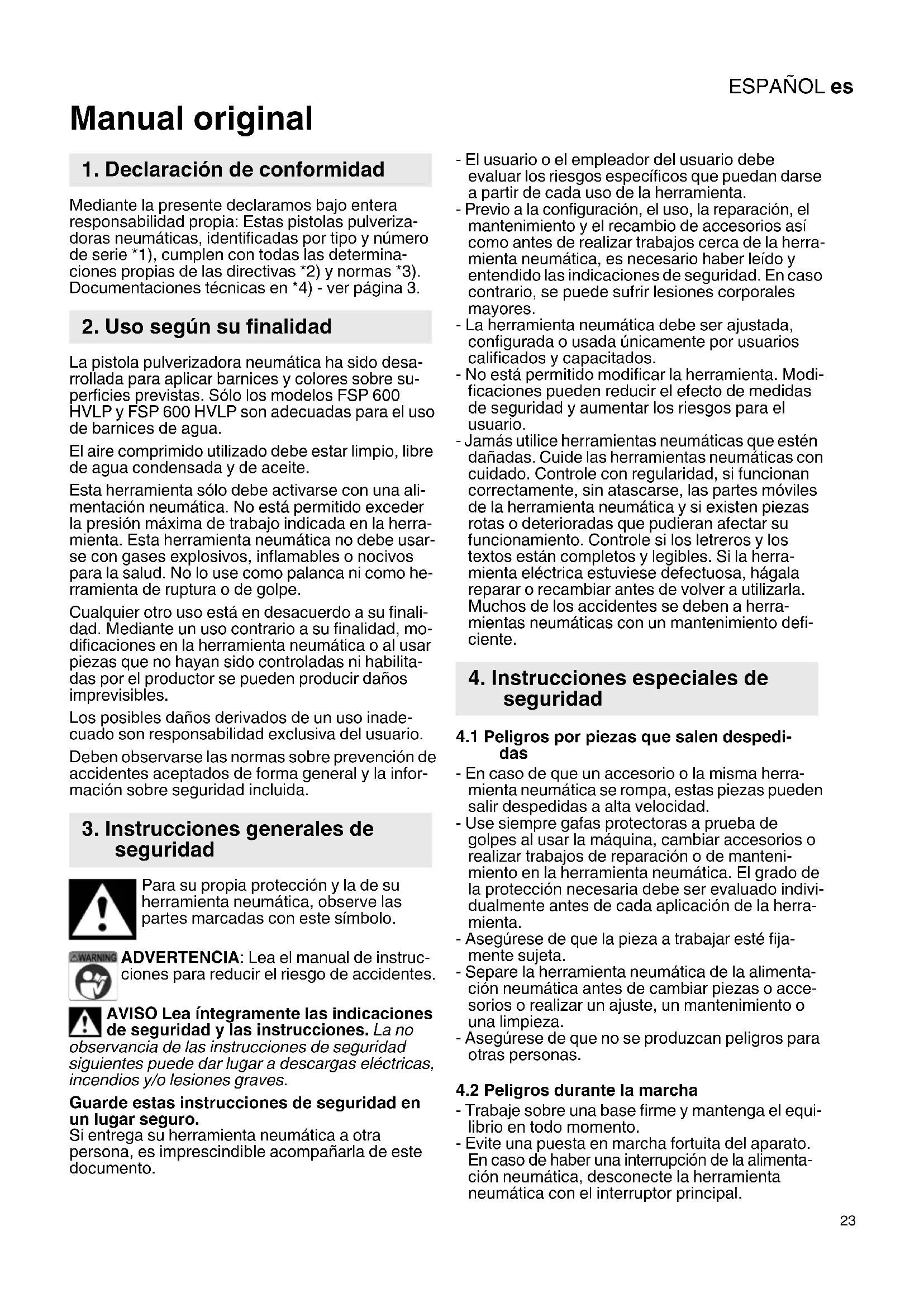 Manual original Mediante la presente declaramos bajo entera responsabilidad propia: Estas pistolas pulveriza- doras neumáticas, identificadas por tipo y número de serie *1), cumplen con todas las determina- ciones propias de las directivas *2) y normas *3). Documentaciones técnicas en *4) - ver página 3. La pistola pulverizadora neumática ha sido desa- rrollada para aplicar barnices y colores sobre su- perficies previstas. Sólo los modelos FSP 600 HVLP y FSP 600 HVLP son adecuadas para el uso de barnices de agua. El aire comprimido utilizado debe estar limpio, libre de agua condensada y de aceite. Esta herramienta sólo debe activarse con una ali- mentación neumática. No está permitido exceder la presión máxima de trabajo indicada en la herra- mienta. Esta herramienta neumática no debe usar- se con gases explosivos, inflamables o nocivos para la salud. No lo use como palanca ni como he- rramienta de ruptura o de golpe. Cualquier otro uso está en desacuerdo a su finali- dad. Mediante un uso contrario a su finalidad, mo- dificaciones en la herramienta neumática o al usar piezas que no hayan sido controladas ni habilita- das por el productor se pueden producir daños imprevisibles. Los posibles daños derivados de un uso inade- cuado son responsabilidad exclusiva del usuario. Deben observarse las normas sobre prevención de accidentes aceptados de forma general y la infor- mación sobre seguridad incluida. Para su propia protección y la de su herramienta neumática, observe las partes marcadas con este símbolo. ADVERTENCIA: Lea el manual de instruc- ciones para reducir el riesgo de accidentes. AVISO Lea íntegramente las indicaciones de seguridad y las instrucciones. La no observancia de las instrucciones de seguridad siguientes puede dar lugar a descargas eléctricas, incendios y/o lesiones graves. Guarde estas instrucciones de seguridad en un lugar seguro. Si entrega su herramienta neumática a otra persona, es imprescindible acompañarla de este documento. - El usuario o el empleador del usuario debe evaluar los riesgos específicos que puedan darse a partir de cada uso de la herramienta. - Previo a la configuración, el uso, la reparación, el mantenimiento y el recambio de accesorios así como antes de realizar trabajos cerca de la herra- mienta neumática, es necesario haber leído y entendido las indicaciones de seguridad. En caso contrario, se puede sufrir lesiones corporales mayores. - La herramienta neumática debe ser ajustada, configurada o usada únicamente por usuarios calificados y capacitados. - No está permitido modificar la herramienta. Modi- ficaciones pueden reducir el efecto de medidas de seguridad y aumentar los riesgos para el usuario. - Jamás utilice herramientas neumáticas que estén dañadas. Cuide las herramientas neumáticas con cuidado. Controle con regularidad, si funcionan correctamente, sin atascarse, las partes móviles de la herramienta neumática y si existen piezas rotas o deterioradas que pudieran afectar su funcionamiento. Controle si los letreros y los textos están completos y legibles. Si la herra- mienta eléctrica estuviese defectuosa, hágala reparar o recambiar antes de volver a utilizarla. Muchos de los accidentes se deben a herra- mientas neumáticas con un mantenimiento defi- ciente.