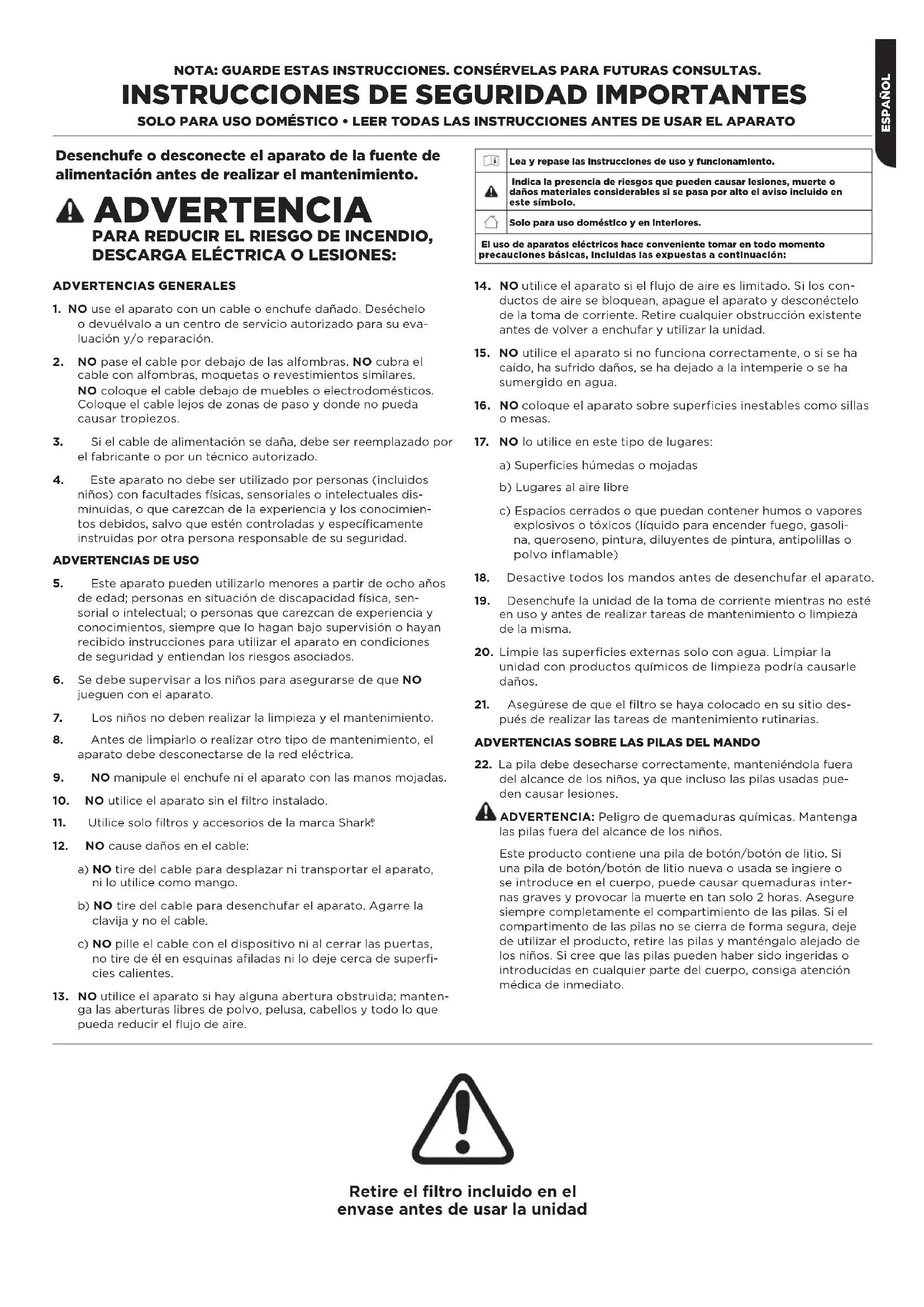 jueguen con el aparato.7. Los niños no deben realizar la limpieza y el mantenimiento.8. Antes de limpiarlo o realizar otro tipo de mantenimiento, el aparato debe desconectarse de la red eléctrica.9. NO manipule el enchufe ni el aparato con las manos mojadas.10. NO utilice el aparato sin el filtro instalado.11. Utilice solo filtros y accesorios de la marca Shark.