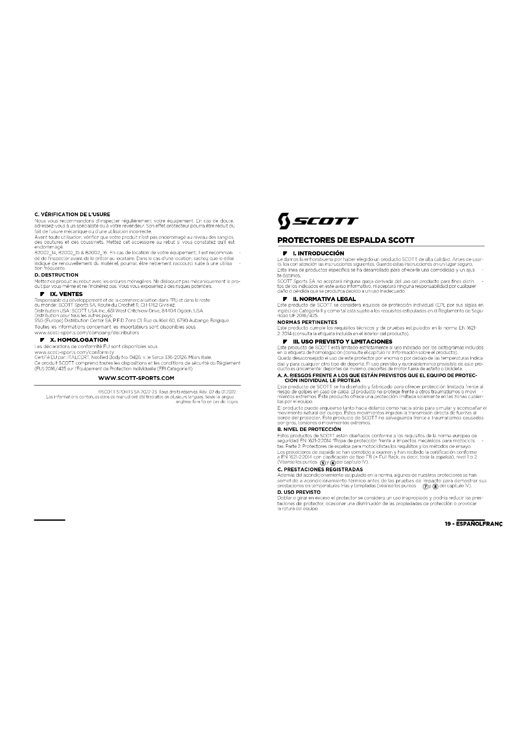 tacto con la transpiración o con sustancias normalmente presentes en productos de higiene per- sonal y no se ha detectado que cause ningún daño cutáneo o corporal. Encontrarás información detallada de los materiales en la etiqueta de cuidado del producto. B. ALMACENAMIENTO No exponga el producto a luz solar directa. No exponga el producto a temperaturas extrema- damente altas o bajas, como las de un coche cerrado o las de un almacenamiento en el exterior. Cuelgue el equipo para secarlo lejos de fuentes de calor directas. SCOTT recomienda que guar- de el equipo a una temperatura de entre 0 °C y 30 °C. El equipo debería ser limpiado cuidadosamente antes de almacenarlo por un largo periodo de tiempo. Guarde el producto en su embalaje original para el almacenamiento y transporte. B2002_14, B2002_15 & B2002_16 : Si su producto se deteriora por culpa de una exposición al calor, o un mal almacenamiento, no está cubierto por ninguna garantía SCOTT.