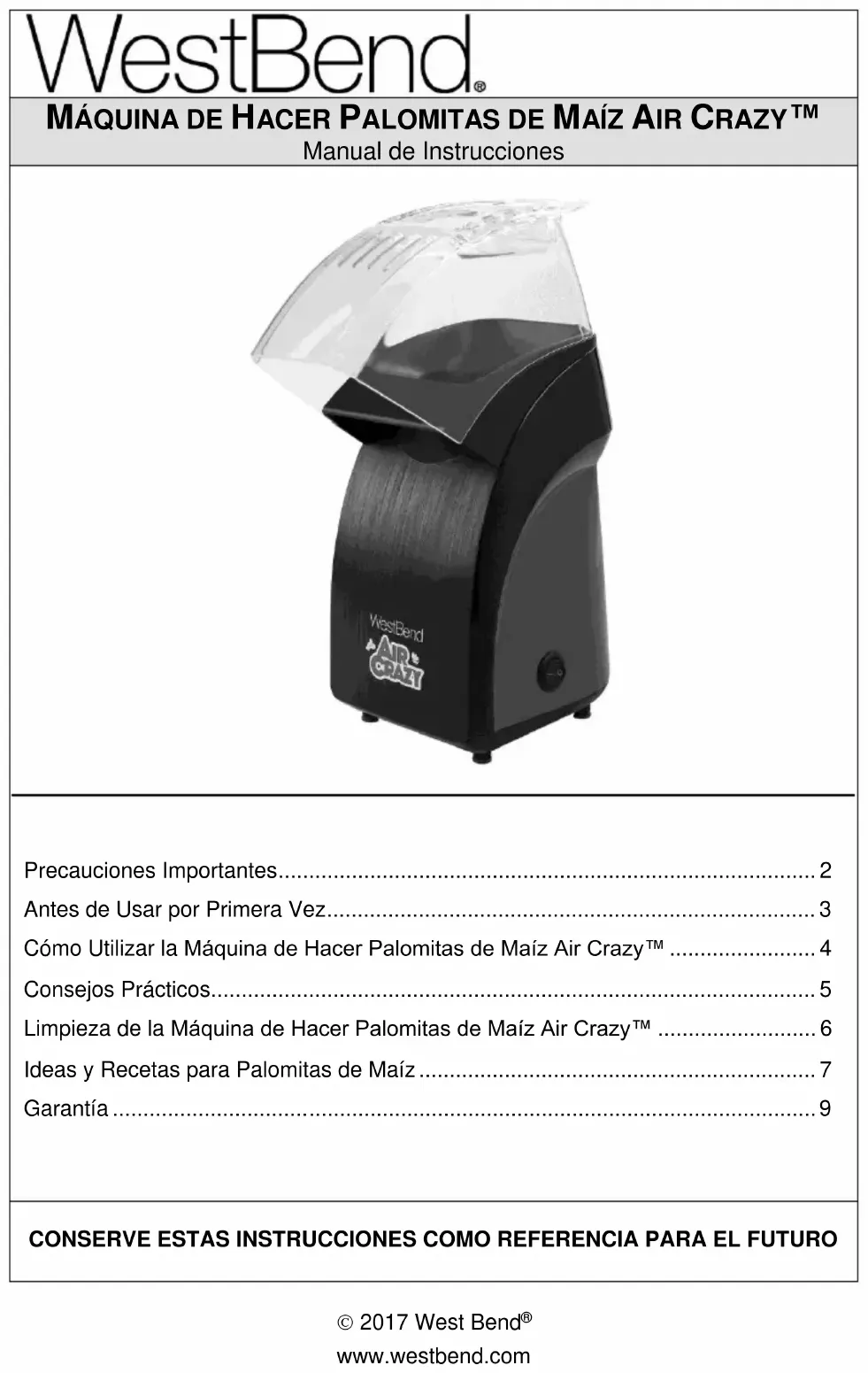 Air Crazy 82471R - Maquina de palomitas WestBend - Manual de uso y guía de instrucciones gratis