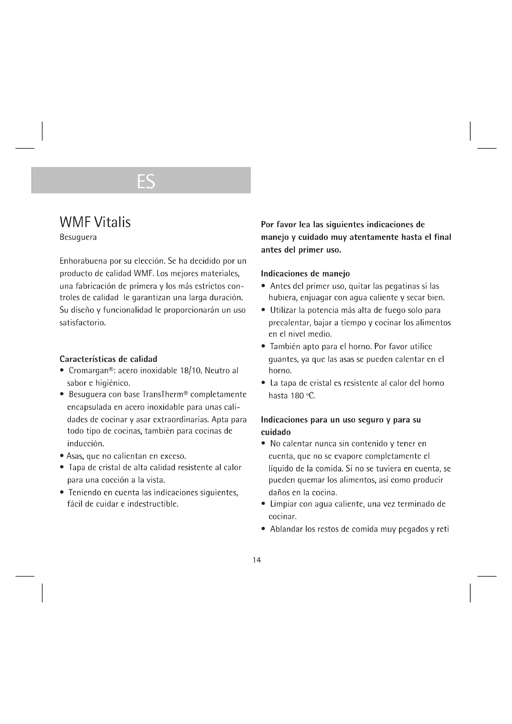 - por el montaje de repuestos no originales Lo mismo es válido para accesorios y repuestos. Si la Ley no dictamina obligatoriamente otra cosa, solo nos hacemos responsables de daños producidos por la actuación desidiosa o intencionada de un representante de nuestra compañía. Cupón de Garantía Para estas baterías de cocina solo utilizamos un material en perfectas condiciones y lo fabricamos según los más modernos procedimientos de fabrica- ción. Por eso garantizamos el material, la fabricación y el funcionamiento. En las reclamaciones de garantía, por favor entregar la mercancía con el cupón de garantía debidamente cumplimentado en su tienda especializada. Tabla de cocción En la siguiente tabla encontrará algunos ejemplos. Los tiempos de cocción dependen de la clase, peso y calidad de los productos. Por eso, puede haber diferencias. Para calentar, utilice el nivel de calor 8 – 8.17 Nivel de calor Duración de cocción Calentar Calentar salchichas en 3 - 4 10 - 15 minutos aqua Cocinar y escalfar Espárragos 5 - 6 20 - 30 minutos Albóndigas, bolas de patata 5 - 6 20 - 30 minutos Estofar Gulash 3 - 4 90 - 120 minutos Redondo de ternera 3 - 4 50 - 60 minutos Estofado 2. - 3. 80 - 100 minutos Asar Rodaja de salmón 4 - 5 10 - 15 minutos Trucha 4 - 5 15 - 25 minutos Calabacines, berenjenas 6 - 7 5 - 10 minutos Pimientos, espárragos verdes 6 - 7 5 - 10 minutos Champiñones 7 - 8 10 - 15 minutos18 WMF Vitalis Rostiera Complimenti per la Vostra scelta. Avete optato per un prodotto di qualità WMF. Materiali pregiati, lavo- razione ineccepibile e accurati controlli di qualità garantiscono una lunga durata. Il design appropri- ato e l’ottima funzionalità assicurano un utilizzo durevole. Caratteristiche