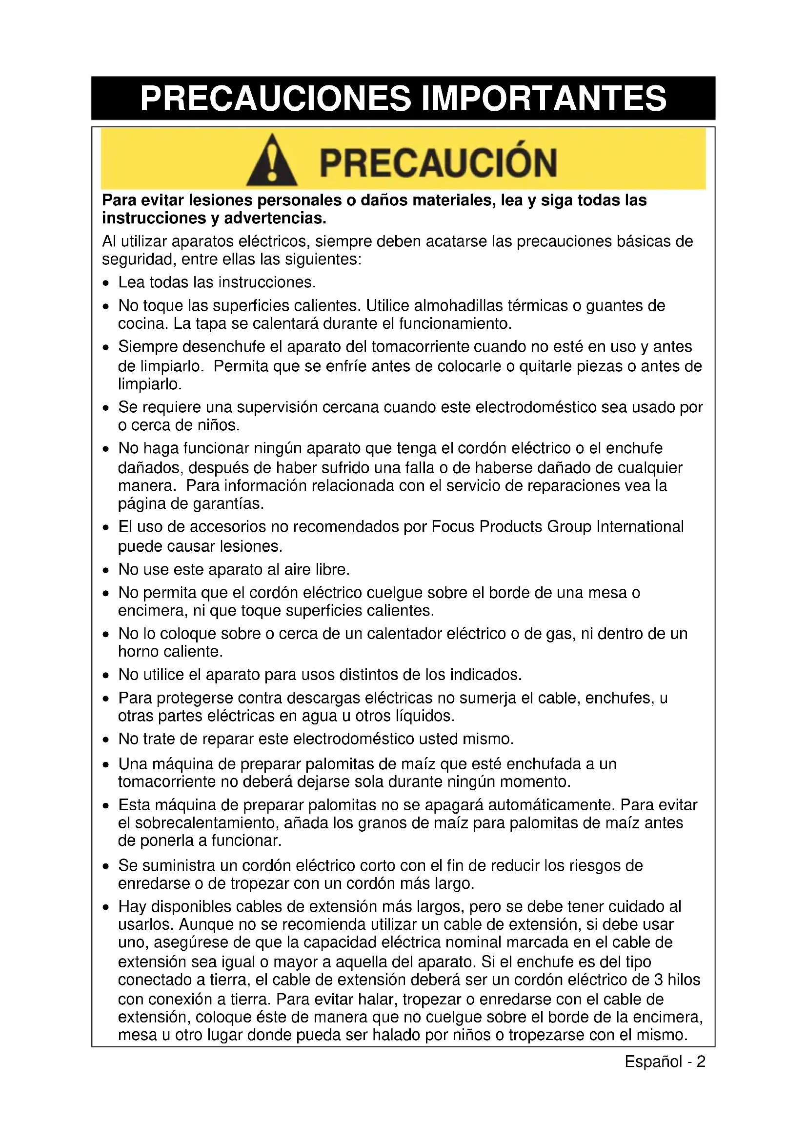 Para evitar lesiones personales o daños materiales, lea y siga todas las instrucciones y advertencias. Al utilizar aparatos eléctricos, siempre deben acatarse las precauciones básicas de seguridad, entre ellas las siguientes: Lea todas las instrucciones. No toque las superficies calientes. Utilice almohadillas térmicas o guantes de cocina. La tapa se calentará durante el funcionamiento. Siempre desenchufe el aparato del tomacorriente cuando no esté en uso y antes de limpiarlo. Permita que se enfríe antes de colocarle o quitarle piezas o antes de limpiarlo. Se requiere una supervisión cercana cuando este electrodoméstico sea usado por o cerca de niños. No haga funcionar ningún aparato que tenga el cordón eléctrico o el enchufe dañados, después de haber sufrido una falla o de haberse dañado de cualquier manera. Para información relacionada con el servicio de reparaciones vea la página de garantías. El uso de accesorios no recomendados por Focus Products Group International puede causar lesiones. No use este aparato al aire libre. No permita que el cordón eléctrico cuelgue sobre el borde de una mesa o encimera, ni que toque superficies calientes. No lo coloque sobre o cerca de un calentador eléctrico o de gas, ni dentro de un horno caliente. No utilice el aparato para usos distintos de los indicados. Para protegerse contra descargas eléctricas no sumerja el cable, enchufes, u otras partes eléctricas en agua u otros líquidos. No trate de reparar este electrodoméstico usted mismo. Una máquina de preparar palomitas de maíz que esté enchufada a un tomacorriente no deberá dejarse sola durante ningún momento. Esta máquina de preparar palomitas no se apagará automáticamente. Para evitar el sobrecalentamiento, añada los granos de maíz para palomitas de maíz antes de ponerla a funcionar. Se suministra un cordón eléctrico corto con el fin de reducir los riesgos de enredarse o de tropezar con un cordón más largo. Hay disponibles cables de extensión más largos, pero se debe tener cuidado al usarlos. Aunque no se recomienda utilizar un cable de extensión, si debe usar uno, asegúrese de que la capacidad eléctrica nominal marcada en el cable de extensión sea igual o mayor a aquella del aparato. Si el enchufe es del tipo conectado a tierra, el cable de extensión deberá ser un cordón eléctrico de 3 hilos con conexión a tierra. Para evitar halar, tropezar o enredarse con el cable de extensión, coloque éste de manera que no cuelgue sobre el borde de la encimera, mesa u otro lugar donde pueda ser halado por niños o tropezarse con el mismo.Español - 3 Este aparato tiene un enchufe polarizado (una clavija es más ancha que la otra). Para reducir el riesgo de una descarga eléctrica, este enchufe está diseñado para encajar de una sola manera dentro del tomacorriente polarizado. Invierta el enchufe si éste no encaja completamente en el tomacorriente o el cable de extensión. Si el enchufe todavía no encaja, consulte con un electricista calificado. No trate de modificar el enchufe de manera alguna. No use un tomacorriente o cable de extensión en el cual el enchufe calce flojamente, o si el tomacorriente o el cable de extensión se calientan. Mientras esté en uso, no retire la tapa. No retire la tapa del aparato hasta tanto no haya oído reventar un grano de maíz durante por lo menos 1 minuto. Sólo para uso doméstico.