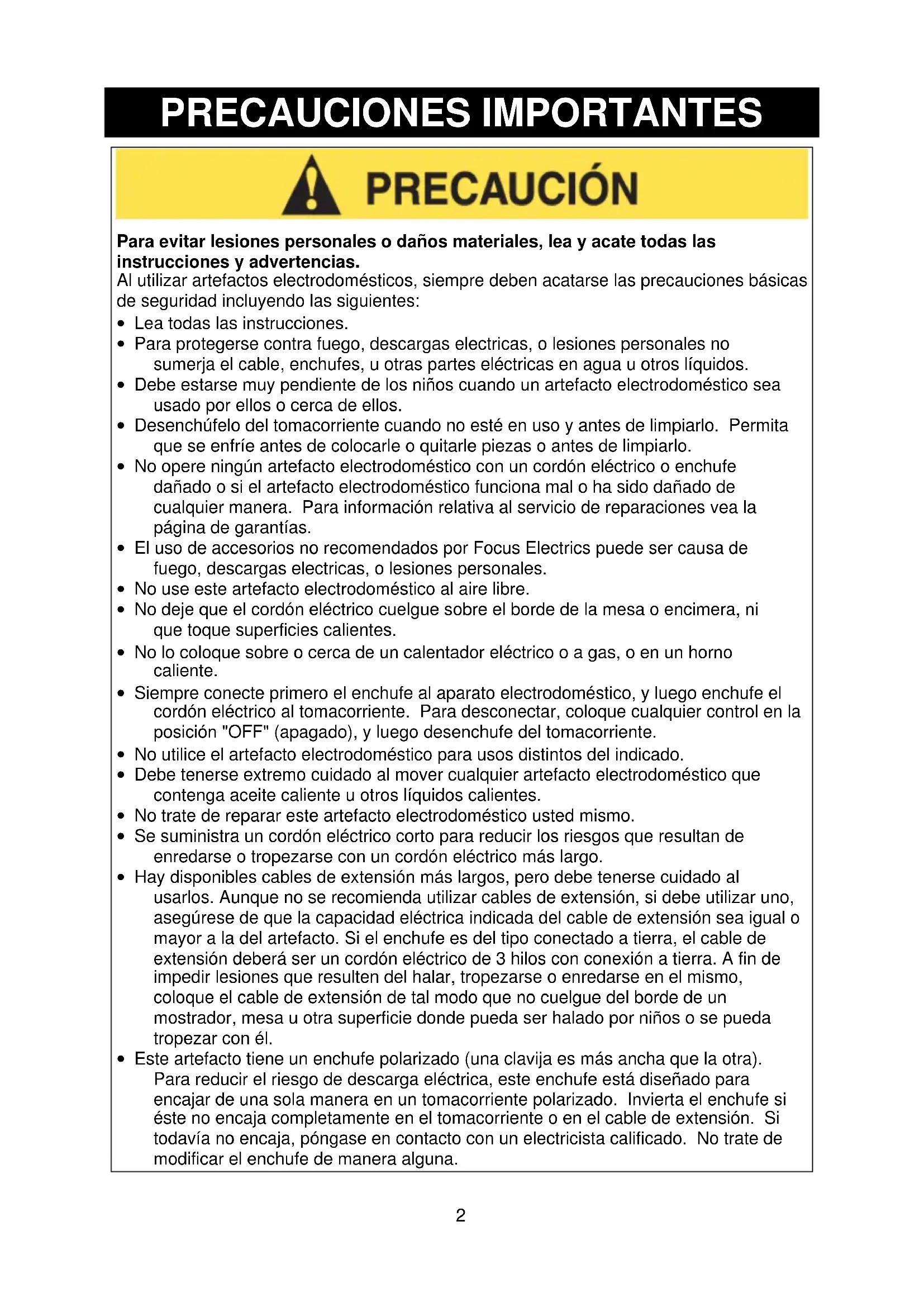 Garantía limitada de 1 año del artefacto Focus Electrics, LLC (“Focus Electrics”) garantiza que este aparato no presentará fallas de material ni fabricación durante un (1) año a partir de la fecha original de compra con prueba de dicha compra, siempre y cuando el aparato sea operado y mantenido tal como se indica en el manual de instrucciones provisto. Toda pieza del aparato que presente fallas será reparada o reemplazada sin costo alguno a criterio de Focus Electrics. Esta garantía rige solamente para el uso domestico dentro de la casa. Esta garantía no cubre ningún daño, incluyendo la decoloración, de superficie anti-adherente alguna del aparato electrodoméstico. Esta garantía es nula y sin valor, según lo determine exclusivamente Focus Electrics si el artefacto electrodoméstico es dañado a causa de accidente, mal uso, abuso, negligencia, rayaduras, o si el artefacto electrodoméstico es cambiado de algún modo.