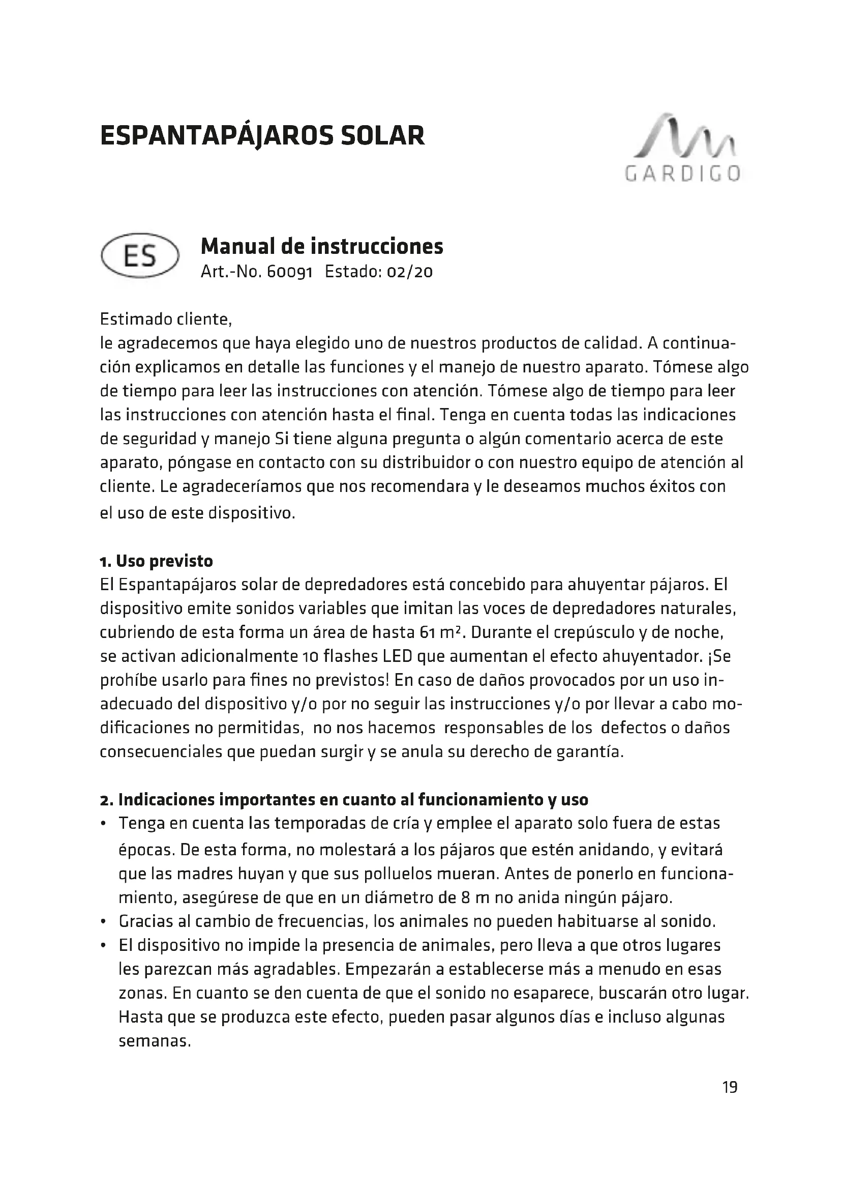 - Si el dispositivo llega a ensuciarse, límpielo con un trapo húmedo. No use limpia- dores abrasivos ni disolventes. Servicio: service@gardigo.de Su Equipo Gardigo Este producto no se puede tirar al cubo de basura convencional al final de su vida útil, sino que debe ser entregado en un punto de recogida para el reciclaje de aparatos eléctricos y elec- trónicos. El símbolo que aparece en el producto, en las instrucciones de uso o en el paquete hace referencia a esto. Los materiales son reutilizables de acuerdo con su identificación. Al reutilizar, utilizar como material o utilizar de alguna otra forma aparatos antiguos está pres- tando un importante servicio a la protección de nuestro medio ambiente. Por favor, pregunte por el puesto de gestión de residuos en su administración local. Indicaciones para la protección del medio ambiente Las pilas/baterías están sometidas a disposiciones legales. Por ello, deberá entregarlas después de su uso en el punto de venta o en un centro de recogida de residuos pertenecien- te a los organismos públicos responsables de la gestión de los residuos. No deseche nunca baterías o pilas en la basura doméstica, bolsas amarillas o similares. Las pilas o baterías sólo deben desecharse en el depósito de recogida de pilas usadas cuando estén descarga- das y después de haber tomado precauciones contra cortocircuitos (p. ej. cubrir los polos). Indicaciones sobre la eliminación de las pilas25 SPAVENTAPASSERI SOLARE Istruzioni per l’uso Art.-No. 60091 Stato: 02/20 Gentile cliente, grazie per aver scelto uno dei nostri prodotti di alta qualità. Qui di seguito spieghia- mo le funzioni e le modalità d’uso del nostro dispositivo, che vi invitiamo a leggere attentamente e a seguire scrupolosamente. Porre estrema attenzione a tutte le nor- me di sicurezza e di funzionamento indicate. Per domande o suggerimenti concer- nenti il presente apparecchio, rivolgetevi ai rivenditori specializzati o al nostro team di assistenza. Saremo lieti se l’uso di questo dispositivo soddisferà le vostre esigenze e se consiglieresti nostri prodotti ad altri.