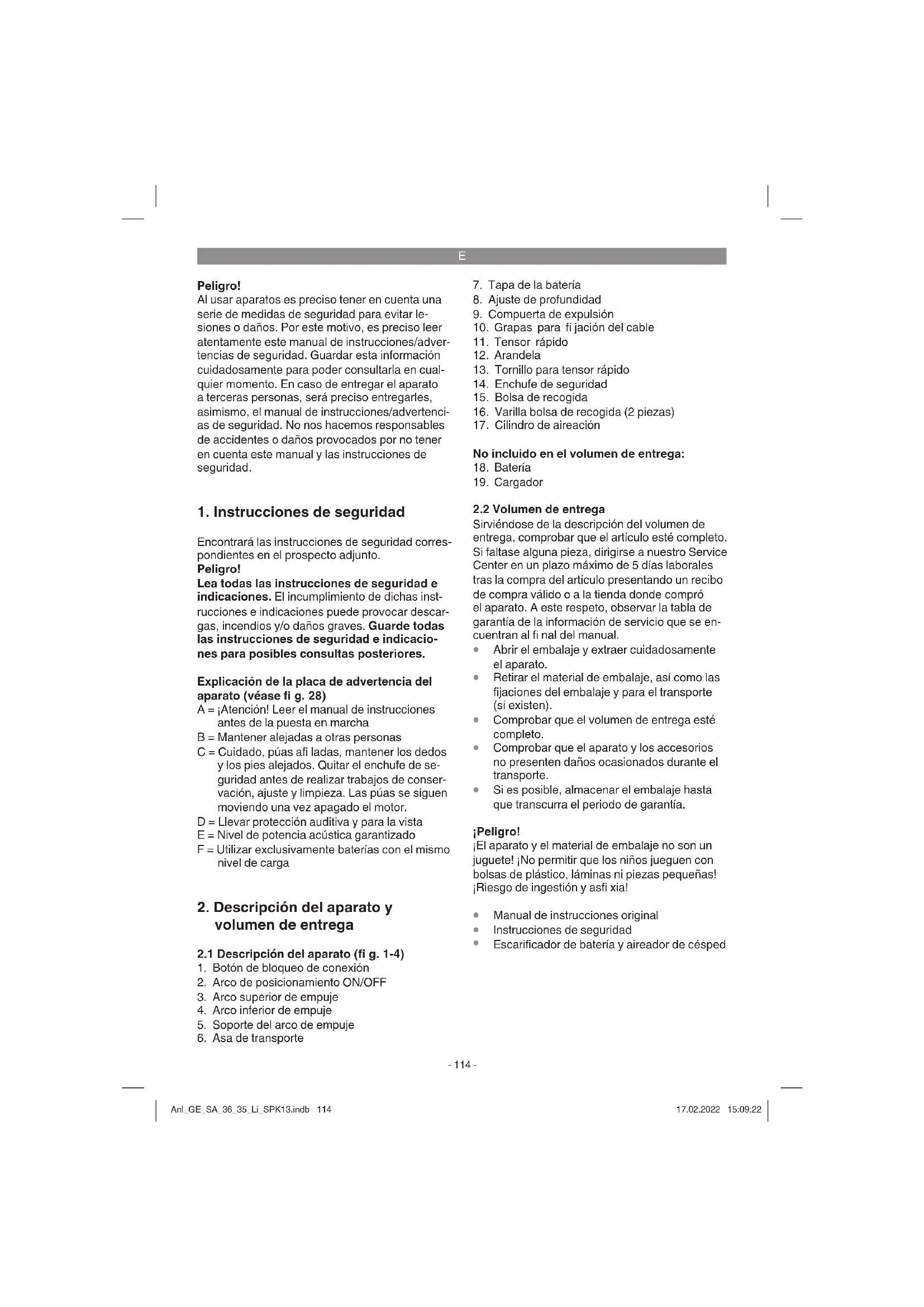 y la batería a nuestro servicio de asistencia técnica. Para realizar un envío adecuado, ponerse en contacto con nuestro servicio de asistencia técnica o con el punto de venta en el que se compró el aparato. Para el envío o la eliminación de baterías o del aparato, estos deben embalarse por separado en bolsas de plástico para evitar cortocircuitos e incendios. Es preciso recargar siempre a tiempo la batería para procurar que dure lo máximo posible. Ha- cerlo es imprescindible también en cuanto se detecta que disminuye el rendimiento del aparato. No descargar jamás la batería por completo. Esto podría provocar un defecto en la batería. Montaje de la batería (fi g. 18-19) Abrir la tapa de la batería (fi g. 18/pos 7). A con- tinuación, introducir las dos baterías en el alo- jamiento como se muestra en la fi gura 19 hasta que se escuche cómo se enclavan. ¡Advertencia! Utilizar sólo baterías con el mismo nivel de carga, no combinar nunca baterías totalmente cargadas y baterías cargadas a la mitad. Cargar siempre las dos baterías a la vez. La batería con el nivel de carga inferior determina el tiempo de funcionamiento del aparato. Las dos baterías deben estar cargadas completamente antes de poner el aparato en funcionamiento. Cerrar la tapa de las baterías plegándola y ase- gurarse de que encaje correctamente. Indicador de capacidad de la batería (fi g. 20) Pulsar en el interruptor para indicar la capacidad de batería (fi g. 20/pos. A). El indicador de capaci- dad de batería (fi g. 20/pos. B) le indica el estado de carga de la batería sirviéndose de 3 LED. Si los 3 LED están iluminados: La batería está completamente cargada. Si están iluminados 1 o 2 LED: La batería dispone de sufi ciente carga residual. Si 1 LED parpadea: La batería está vacía, es preciso cargarla. Anl_GE_SA_36_35_Li_SPK13.indb 117Anl_GE_SA_36_35_Li_SPK13.indb 117 17.02.2022 15:09:2317.02.2022 15:09:23E