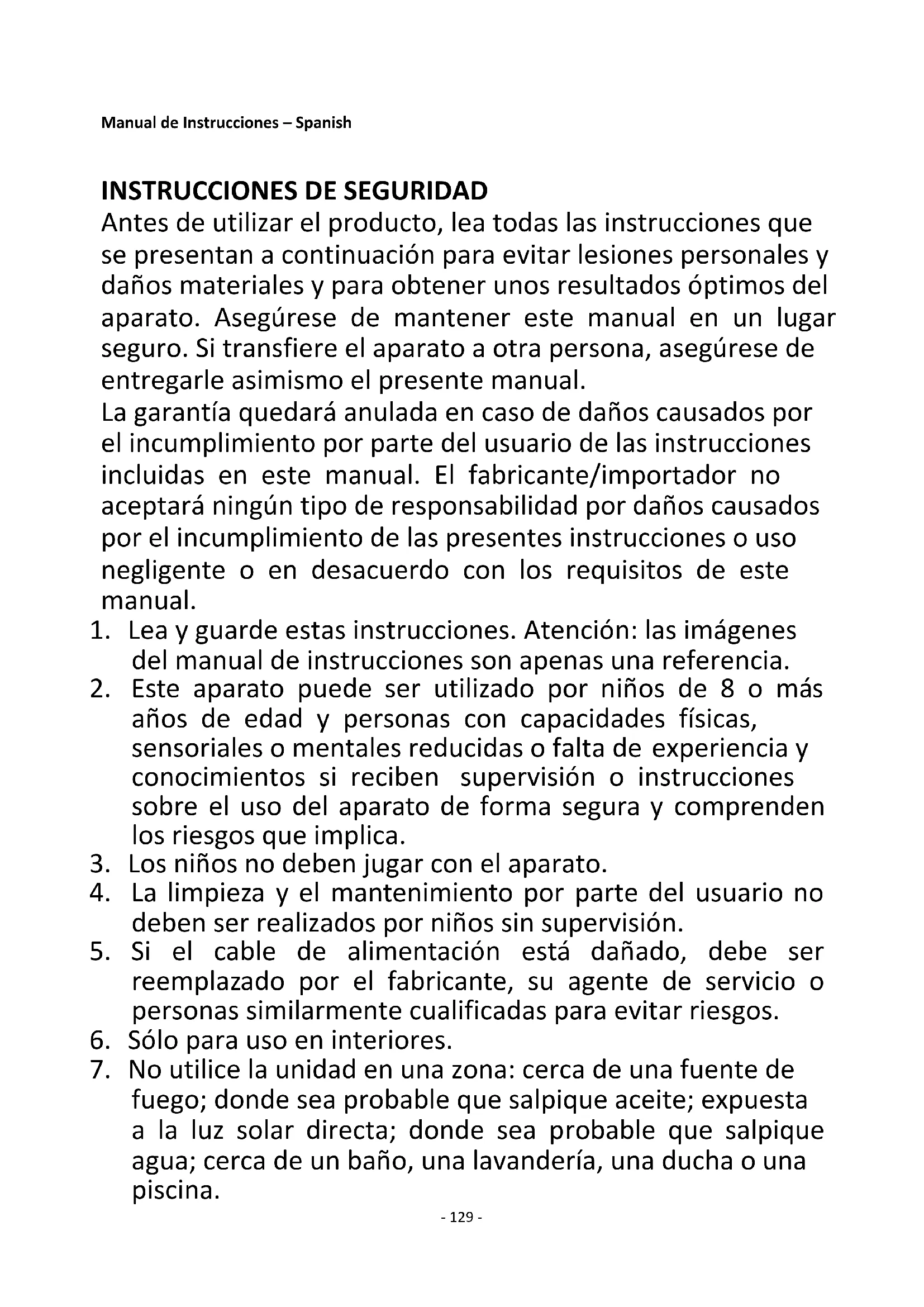 Antes de utilizar el producto, lea todas las instrucciones que se presentan a continuación para evitar lesiones personales y daños materiales y para obtener unos resultados óptimos del aparato. Asegúrese de mantener este manual en un lugar seguro. Si transfiere el aparato a otra persona, asegúrese de entregarle asimismo el presente manual. La garantía quedará anulada en caso de daños causados por el incumplimiento por parte del usuario de las instrucciones incluidas en este manual. El fabricante/importador no aceptará ningún tipo de responsabilidad por daños causados por el incumplimiento de las presentes instrucciones o uso negligente o en desacuerdo con los requisitos de este manual.