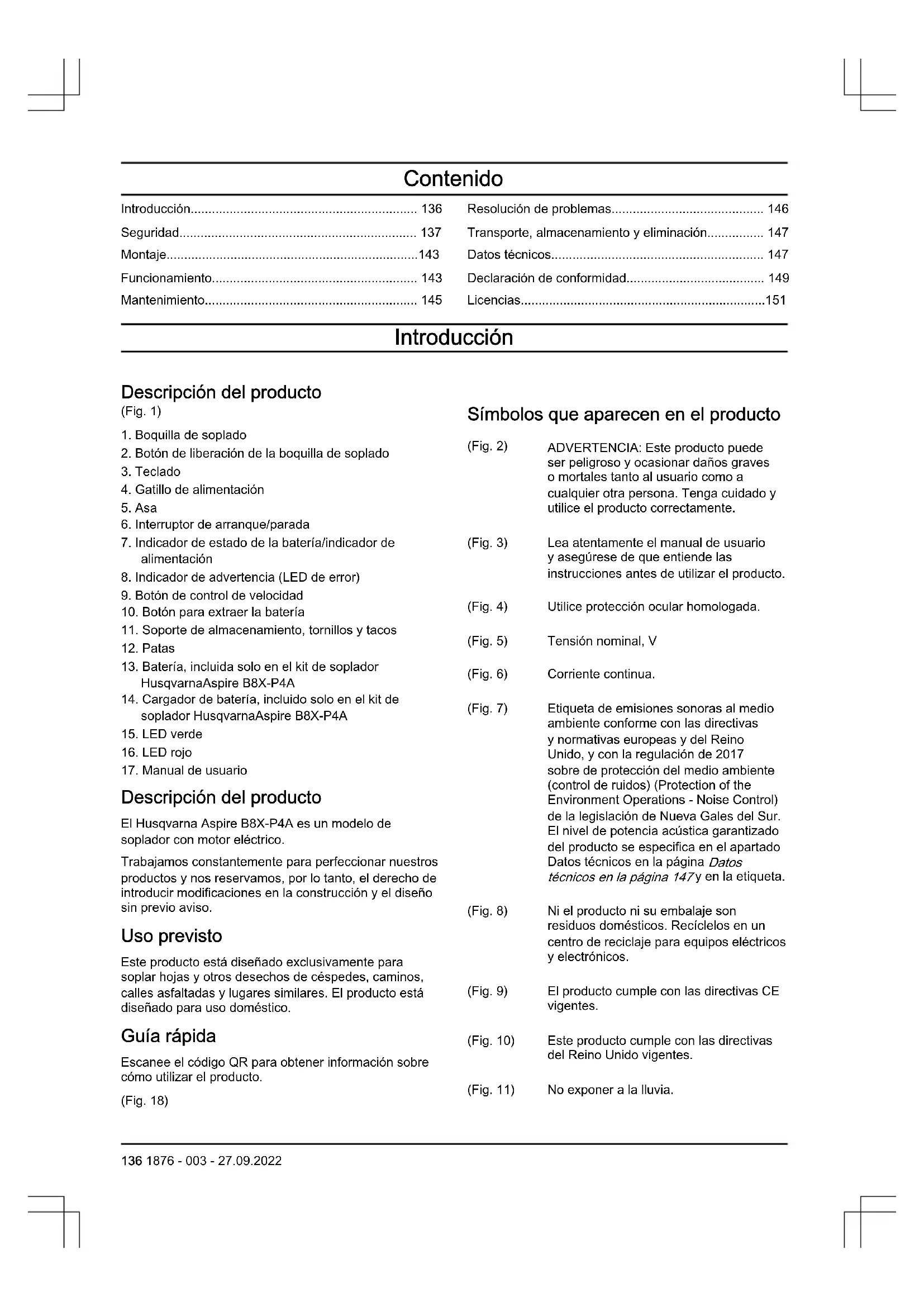 Descripción del producto El Husqvarna Aspire B8X-P4A es un modelo de soplador con motor eléctrico. Trabajamos constantemente para perfeccionar nuestros productos y nos reservamos, por lo tanto, el derecho de introducir modificaciones en la construcción y el diseño sin previo aviso. Uso previsto Este producto está diseñado exclusivamente para soplar hojas y otros desechos de céspedes, caminos, calles asfaltadas y lugares similares. El producto está diseñado para uso doméstico. Guía rápida Escanee el código QR para obtener información sobre cómo utilizar el producto. (Fig. 18) Símbolos que aparecen en el producto (Fig. 2) ADVERTENCIA: Este producto puede ser peligroso y ocasionar daños graves o mortales tanto al usuario como a cualquier otra persona. Tenga cuidado y utilice el producto correctamente. (Fig. 3) Lea atentamente el manual de usuario y asegúrese de que entiende las instrucciones antes de utilizar el producto. (Fig. 4) Utilice protección ocular homologada. (Fig. 5) Tensión nominal, V (Fig. 6) Corriente continua. (Fig. 7) Etiqueta de emisiones sonoras al medio ambiente conforme con las directivas y normativas europeas y del Reino Unido, y con la regulación de 2017 sobre de protección del medio ambiente (control de ruidos) (Protection of the Environment Operations - Noise Control) de la legislación de Nueva Gales del Sur. El nivel de potencia acústica garantizado del producto se especifica en el apartado Datos técnicos en la página Datos técnicos en la página 147 y en la etiqueta. (Fig. 8) Ni el producto ni su embalaje son residuos domésticos. Recíclelos en un centro de reciclaje para equipos eléctricos y electrónicos. (Fig. 9) El producto cumple con las directivas CE vigentes. (Fig. 10) Este producto cumple con las directivas del Reino Unido vigentes. (Fig. 11) No exponer a la lluvia. 136 1876 - 003 - 27.09.2022(Fig. 15) El usuario del soplador de hojas debe asegurarse de que ninguna persona ni animal se acerque a menos de 15 metros. Cuando haya varios operarios trabajando en el mismo lugar, la dis- tancia de seguridad entre ellos debe ser de 15 metros. El soplador de hojas puede hacer que salgan despedidos objetos con mucha fuerza que pueden rebotar. Si no se utiliza el equipo de seguridad recomendado, se pueden producir daños oculares graves. aaaa ssxxxxx En la placa de características técnicas se indica el número de serie. aaaa es el año de producción y ss indica la semana de producción. Nota: Los demás símbolos o etiquetas que aparecen en el producto corresponden a requisitos de homologación específicos en determinados mercados. Símbolos que aparecen en la batería o en el cargador de la batería (Fig. 16) Recicle el producto en un centro de re- ciclaje para equipos eléctricos y electróni- cos. (Aplicable solo para Europa) (Fig. 17) Use la batería sola- mente en productos de socios que utilicen el sistema POWER FOR ALL. (Fig. 12) Transformador a prueba de fallos. (Fig. 13) Utilice y guarde el cargador de baterías únicamente en interiores. (Fig. 14) Doble aislamiento. Responsabilidad sobre el producto Como se estipula en las leyes de responsabilidad del producto, no nos hacemos responsables de los daños y perjuicios causados por nuestro producto si: