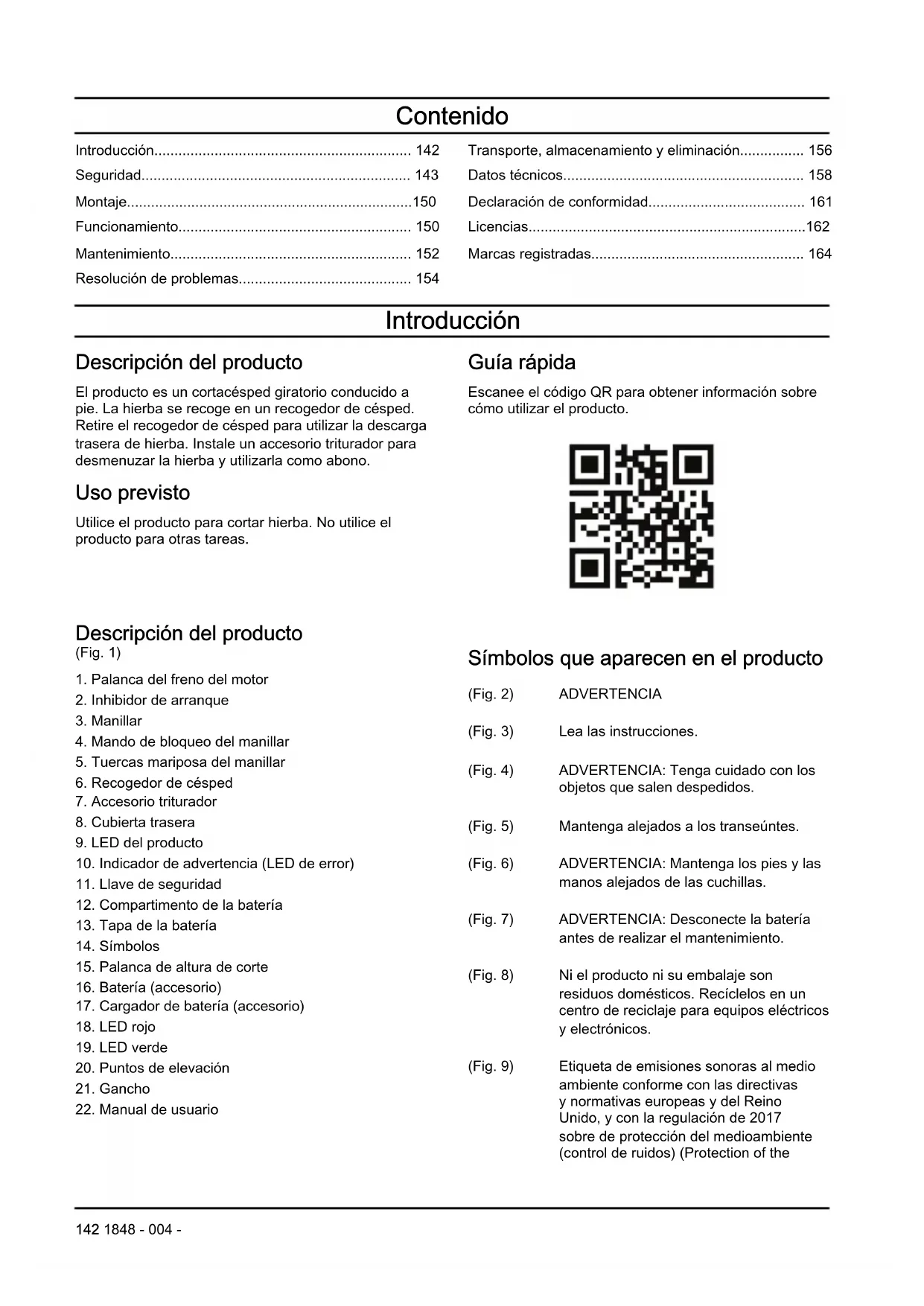 Símbolos que aparecen en el producto (Fig. 2) ADVERTENCIA (Fig. 3) Lea las instrucciones. (Fig. 4) ADVERTENCIA: Tenga cuidado con los objetos que salen despedidos. (Fig. 5) Mantenga alejados a los transeúntes. (Fig. 6) ADVERTENCIA: Mantenga los pies y las manos alejados de las cuchillas. (Fig. 7) ADVERTENCIA: Desconecte la batería antes de realizar el mantenimiento. (Fig. 8) Ni el producto ni su embalaje son residuos domésticos. Recíclelos en un centro de reciclaje para equipos eléctricos y electrónicos. (Fig. 9) Etiqueta de emisiones sonoras al medio ambiente conforme con las directivas y normativas europeas y del Reino Unido, y con la regulación de 2017 sobre de protección del medioambiente (control de ruidos) (Protection of the 142 1848 - 004 -Environment Operations - Noise Control) de la legislación de Nueva Gales del Sur. El nivel de potencia acústica garantizado del producto se especifica en el apartado Datos técnicos en la página 158 y en la etiqueta. (Fig. 10) Este equipo cumple con las directivas CE vigentes. (Fig. 11) Este producto cumple con las directivas del Reino Unido vigentes. (Fig. 12) El producto está protegido contra salpicaduras. (Fig. 13) Suelte la palanca del freno del motor para detenerse. (Fig. 14) Empuje la palanca del freno motor para accionar las cuchillas. (Fig. 15) Código escaneable. (Fig. 18) Gire para bloquear o desbloquear. Nota: Los demás símbolos y etiquetas que aparecen en el producto corresponden a requisitos de homologación específicos en algunos mercados. Símbolos que aparecen en la batería o en el cargador de la batería (Fig. 19) Recicle el producto en un centro de re- ciclaje para equipos eléctricos y electróni- cos. (Aplicable solo para Europa) (Fig. 20) Use la batería sola- mente en productos de socios que utilicen el sistema POWER FOR ALL. (Fig. 21) Proteja la batería del calor, por ejemplo, de la luz solar directa y continua, del fuego, de la suciedad, del agua y de la humedad. Existe riesgo de explosión o cortocircuito. (Fig. 22) (Fig. 16) Utilice y guarde el cargador de baterías únicamente en interiores. (Fig. 17) Doble aislamiento. Etiqueta del producto (Fig. 23) PELIGRO: Mantenga las manos y los pies alejados. Responsabilidad sobre el producto Como se estipula en las leyes de responsabilidad del producto, no nos hacemos responsables de los daños y perjuicios causados por nuestro producto si: