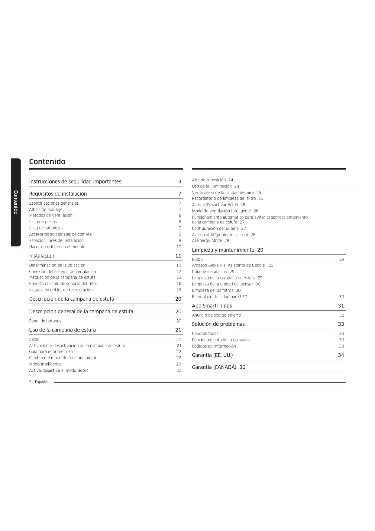 QUESTIONS OR COMMENTS? COUNTRY CALL OR VISIT US ONLINE AT U.S.A - Consumer Electronics 1-800-SAMSUNG (726-7864) www.samsung.com/us/support CANADA 1-800-SAMSUNG (726-7864) www.samsung.com/ca/support (English) www.samsung.com/ca_fr/support (French)01. SIMPLE_NK30CB600W12AA_DG68-01416C-00_EN.indd 101. SIMPLE_NK30CB600W12AA_DG68-01416C-00_EN.indd 1 2023-01-03 오후 6:46:362023-01-03 오후 6:46:36 Campana de estufa Manual de usuario y de instalación NK30CB700W**/NK36CB700W**2 Español Contenido Aire de reposición 24 Uso de la iluminación 24 Verificación de la calidad del aire 25 Recordatorio de limpieza del filtro 25 Activar/Desactivar Wi-Fi 26 Modo de ventilación inteligente 26 Funcionamiento automático para evitar el sobrecalentamiento de la campana de estufa 27 Configuración del idioma 27 Acceso al AP(punto de acceso) 28 AI Energy Mode 28 Limpieza y mantenimiento 29 Bixby 29 Amazon Alexa y el Asistente de Google 29 Guía de instalación 29 Limpieza de la campana de estufa 29 Limpieza de la unidad del sensor 30 Limpieza de los filtros 30 Reemplazo de la lámpara LED 30 App SmartThings 31 Anuncio de código abierto 32 Solución de problemas 33 Generalidades 33 Funcionamiento de la campana 33 Códigos de información 33 Garantía (EE. UU.) 34 Garantía (CANADÁ) 36 Contenido Instrucciones de seguridad importantes 3 Requisitos de instalación 7 Especificaciones generales 7 Altura de montaje 7 Métodos de ventilación 8 Lista de piezas 8 Lista de subpiezas 9 Accesorios adicionales de compra 9 Espacios libres de instalación 9 Hacer un orificio en el mueble 10 Instalación 11 Determinación de la ubicación 11 Conexión del sistema de ventilación 12 Instalación de la campana de estufa 13 Conecte el cable de soporte del filtro 16 Instalación del kit de recirculación 16 Descripción de la campana de estufa 20 Descripción general de la campana de estufa 20 Panel de botones 20 Uso de la campana de estufa 21 Visor 21 Activación y desactivación de la campana de estufa 21 Guía para el primer uso 22 Cambio del modo de funcionamiento 22 Modo Inteligente 23 Activa/desactiva el modo Boost 23Español 3 Instrucciones de seguridad importantes Instrucciones de seguridad importantes APROBADO SOLO PARA EL USO RESIDENCIAL DE APARATOS