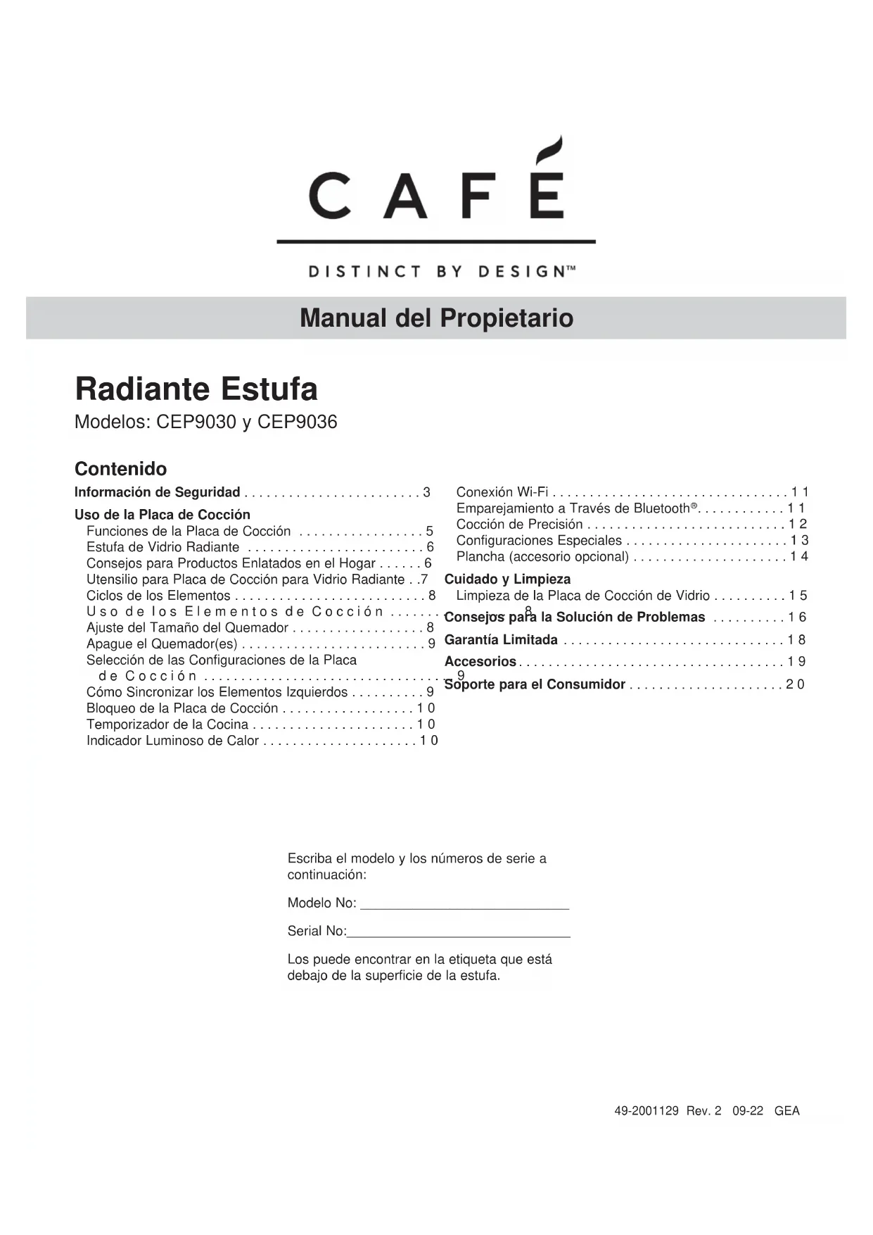 - Soporte para el Consumidor Manual del Propietario2 49-2001129 Rev. 2 GRACIAS POR HACER QUE CAFÉ SEA PARTE DE SU HOGAR. Sentimos orgullo por el nivel de arte, innovación y diseño de cada uno de los electrodomésticos de CAFÉ, y creemos que usted también. Entre otras cosas, el registro de su electrodoméstico asegura que podamos entregarle información importante del producto y detalles de la garantía cuando los necesite. Registre su electrodoméstico CAFÉ ahora a través de Internet. Sitios Web útiles están disponibles en la sección de Soporte para el Consumidor de este Manual del Propietario. También puede enviar una carta en la tarjeta de inscripción preimpresa que se incluye con el material embalado.49-2001129 Rev. 2 3 p. 20