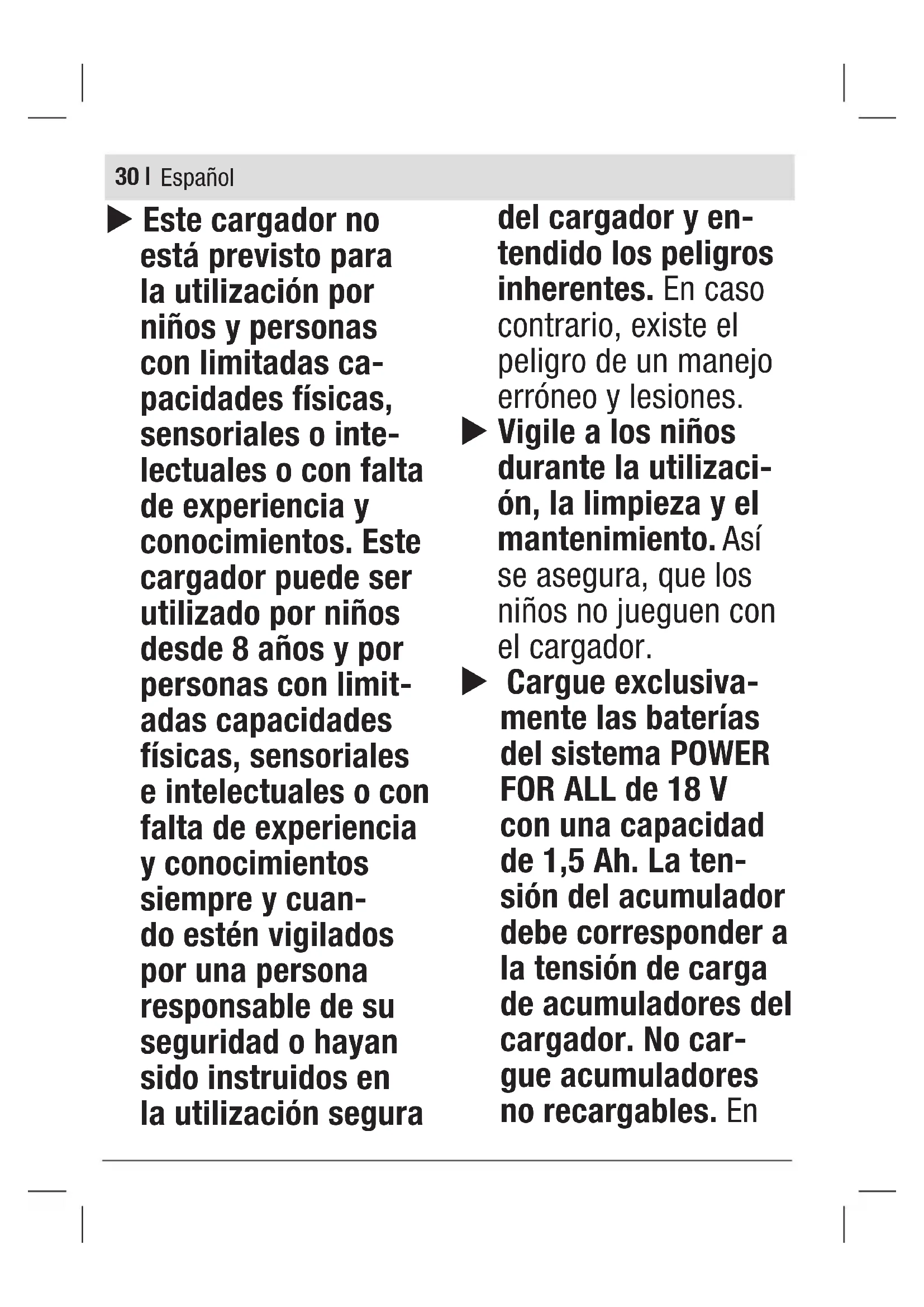 dependiente de la temperatura y del tipo de acumulador Proceso de carga u ¡Preste atención a la tensión de red! La tensión de alimentación deberá coincidir con las indicaciones en la placa decaracterísticas del cargador. Asegúrese de que el compartimiento de carga (3) y los contactos del acumulador estén libres de suciedad tosca. Asegúrese de que el acumulador esté completamen- te insertado. El proceso de carga comienza en tan pronto el enchufe de la red del cargador se conecta a la caja de enchufe y el acumulador se introduce en el compartimiento de carga (3). El proceso de carga sólo es posible cuando la temperatura del acumula- dor se encuentra dentro del margen de temperatura de carga admisible (0–45 °C). El proceso de carga inteligente detecta automáticamente el estado de carga del acumulador y lo carga con la corriente de carga óptima en función de la tempe- ratura y la tensión del acumulador. Español34 | Así se protege el acumulador y se mantiene completamente cargado cuando se guarda en el cargador. Si después de una recarga, el tiempo de funcionamiento del acumulador fuese muy reducido, ello es señal de que éste está agotado y deberá sustituirse. En caso de efectuar recargas continuas o muy seguidas puede que llegue a calentarse el carga- dor. Sin embargo, esto no tiene inconvenientes y no indica un defecto técnico del cargador. Tiempo de carga La siguiente tabla muestra el tiempo aproximado necesario en minutos para el estado de carga deseado, en función del tipo de acumulador. El tiempo de car- ga depende del tipo de acumula- dor y de la temperatura. P4A 18-C70 Baterías recar- gables de 18 V del sistema POWER FOR ALL 1,5 Ah ≈24 ≈33 2,0 Ah ≈32 ≈45 2,5 Ah ≈40 ≈60 3,0 Ah ≈48 ≈72 4,0 Ah ≈64 ≈95 4,0 Ah Power Plus ≈69 ≈88 5,0 Ah ≈80 ≈105 6,0 Ah ≈96 ≈130 corresponde a un estado de carga de ≈ 80 % corresponde a un estado de carga completo Significado de los indicadores Luz intermitente (rápida) del indicador de estado de carga verde El proceso de carga rápida se señaliza mediante un rápido parpadeo del indicador del estado de carga del acumulador verde (2). Español| 35 El acumulador se puede sacar y utilizar en todo momento. Tan pronto se ha alcanzado aprox. 80 % de la capacidad del acumulador, se retarda el parpa- deo del indicador del estado de carga del acumulador verde. El proceso de carga rápida se ha finalizado ahora. Si el acumulador permanece en el cargador, la car- ga se completa a una velocidad más lenta. Luz intermitente (lenta) del indicador de estado de carga verde Con el estado de carga del acumulador de aprox. 80 %, el indicador verde del estado de carga (2) parpadea lentamente. El acumulador se puede tomar para el uso inmediato. Luz permanente del indica- dor del estado de carga del acumulador La luz permanente del indicador verde del estado de carga del acumulador (2) señaliza que el acumulador está totalmente cargado. Seguidamen- te puede retirarse el acumulador e utilizarse inmediatamente. Sin el acumulador colocado, la luz permanente del indicador del estado de carga del acumu- lador (2) señaliza, que el enchufe de red está encajado en la caja de enchufe y el cargador está listo para el funcionamiento. Luz permanente del indi- cador rojo de sistema de control de temperatura La luz permanente del indicador rojo (1) señaliza que la temperatura del acumulador se encuentra fuera del margen de temperatura de carga admisible (0–45 °C). Tan pronto se ha alcanzado el margen de temperatura admisible, comienza el proceso de carga. Español36 | Luz intermitente del indicador rojo - fallo La Luz intermitente del indicador rojo (1) señaliza otro fallo en el proceso de carga (ver „El acumulador no se está cargando“, Página 36). Eliminación de errores El acumulador no se está cargando El acumulador no se está car- gando; el indicador rojo (1) parpadea y el indicador verde del estado de carga (2) está continuamente iluminado. Causa: El cargador ha detectado una avería interna Remedio: Asegúrese de que todas los acumuladores estén completamente insertados. Desenchufe la clavija y vuelva a enchufarla. Si el error vuelve a producirse, haga que un taller de servicio postventa autorizado de Husqvarna compruebe el cargador. Causa: El acumulador no está correctamente encajado Remedio: Inserte el acumulador correctamente en el cargador. Causa: Los contactos del acumu- lador y de la carga están sucios. Remedio: Limpie los contactos del acumulador y de la carga; p.ej., enchufando y desenchufan- do el acumulador varias veces. Causa: Acumulador defectuoso Remedio: Sustituya el acumu- lador. El acumulador no se está car- gando y el indicador (1) está iluminado de color rojo. Causa: Temperatura del acumula- dor fuera del margen de tempera- tura de carga admisible Español| 37 Remedio: Espere hasta que la temperatura del acumulador vuelva a estar dentro del margen de temperatura de carga admisi- ble (0–45 °C). Los indicadores no se encienden No se ilumina ningún indicador, el acumulador no se está cargando. Causa: Caja de enchufe, cable de red o cargador defectuoso Remedio: Compruebe la tensión de la red. Si es necesario, deje revisar el cargador en un centro de servicio autorizado. Causa: El enchufe de red del cargador no está (correctamente) conectado Remedio: Inserte el enchufe de la red (completamente) en la caja de enchufe. Eliminación Los cargadores, accesorios y embalajes deberán someterse a un proceso de recuperación que respete el medio ambiente. ¡No arroje los cargadores a la basura! Sólo para los países de la UE: Conforme a la Directiva Europea 2012/19/UE sobre aparatos eléctricos y electrónicos inservi- bles, tras su transposición en ley nacional, deberán coleccionar- se por separado los cargadores para ser sometidas a un reciclaje ecológico. En el caso de una eliminación inadecuada, los aparatos eléctri- cos y electrónicos pueden tener efectos nocivos para el medio a