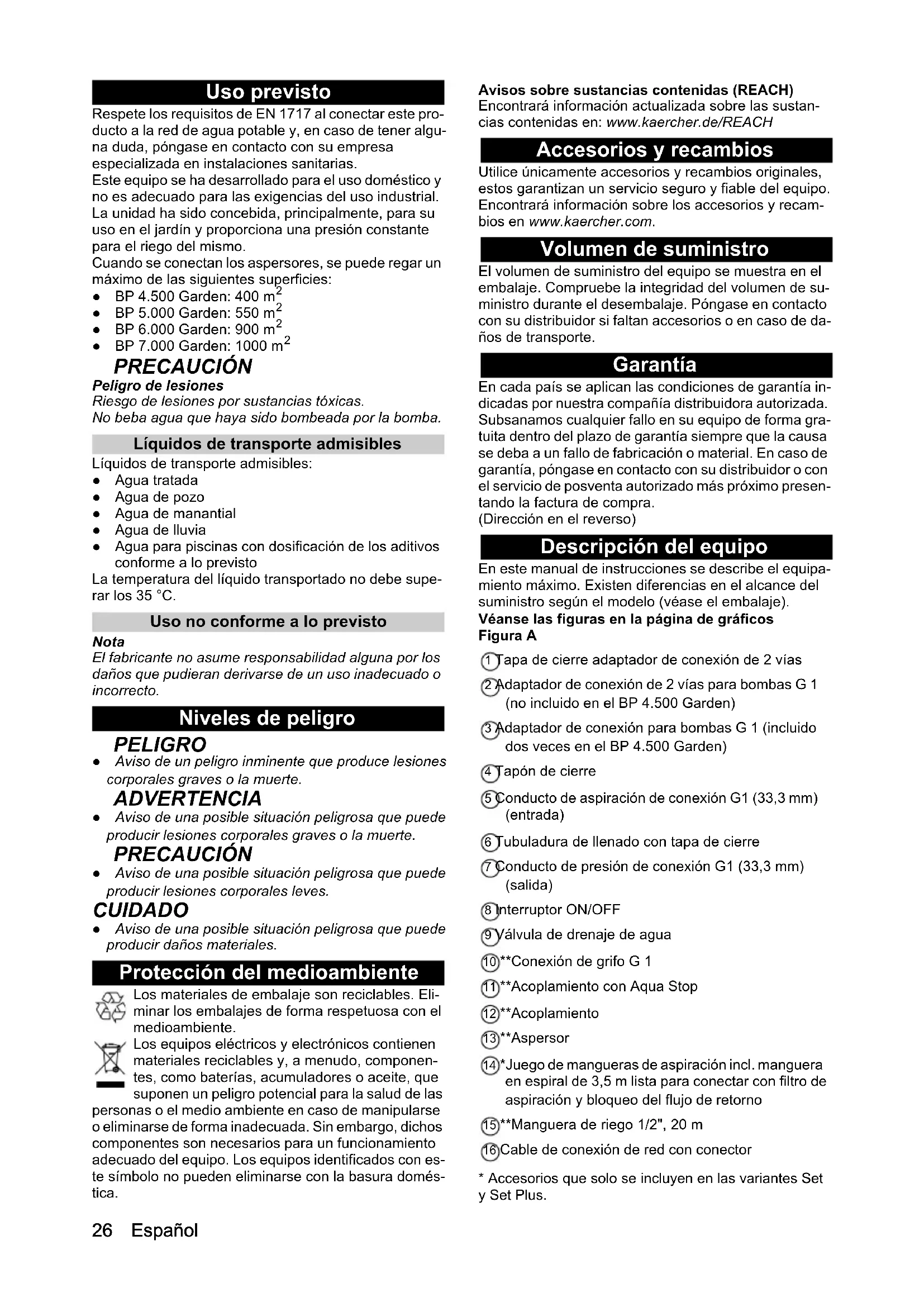 몇 PRECAUCIÓN Peligro de lesiones Riesgo de lesiones por sustancias tóxicas. No beba agua que haya sido bombeada por la bomba. Líquidos de transporte admisibles Líquidos de transporte admisibles: ● Agua tratada ● Agua de pozo ● Agua de manantial ● Agua de lluvia ● Agua para piscinas con dosificación de los aditivos conforme a lo previsto La temperatura del líquido transportado no debe supe- rar los 35 °C. Uso no conforme a lo previsto Nota El fabricante no asume responsabilidad alguna por los daños que pudieran derivarse de un uso inadecuado o incorrecto. Niveles de peligro PELIGRO ● Aviso de un peligro inminente que produce lesiones corporales graves o la muerte. 몇 ADVERTENCIA ● Aviso de una posible situación peligrosa que puede producir lesiones corporales graves o la muerte. 몇 PRECAUCIÓN ● Aviso de una posible situación peligrosa que puede producir lesiones corporales leves. CUIDADO ● Aviso de una posible situación peligrosa que puede producir daños materiales. Protección del medioambiente Los materiales de embalaje son reciclables. Eli- minar los embalajes de forma respetuosa con el medioambiente. Los equipos eléctricos y electrónicos contienen materiales reciclables y, a menudo, componen- tes, como baterías, acumuladores o aceite, que suponen un peligro potencial para la salud de las personas o el medio ambiente en caso de manipularse o eliminarse de forma inadecuada. Sin embargo, dichos componentes son necesarios para un funcionamiento adecuado del equipo. Los equipos identificados con es- te símbolo no pueden eliminarse con la basura domés- tica. Avisos sobre sustancias contenidas (REACH) Encontrará información actualizada sobre las sustan- cias contenidas en: www.kaercher.de/REACH Accesorios y recambios Utilice únicamente accesorios y recambios originales, estos garantizan un servicio seguro y fiable del equipo. Encontrará información sobre los accesorios y recam- bios en www.kaercher.com. Volumen de suministro El volumen de suministro del equipo se muestra en el embalaje. Compruebe la integridad del volumen de su- ministro durante el desembalaje. Póngase en contacto con su distribuidor si faltan accesorios o en caso de da- ños de transporte. Garantía En cada país se aplican las condiciones de garantía in- dicadas por nuestra compañía distribuidora autorizada. Subsanamos cualquier fallo en su equipo de forma gra- tuita dentro del plazo de garantía siempre que la causa se deba a un fallo de fabricación o material. En caso de garantía, póngase en contacto con su distribuidor o con el servicio de posventa autorizado más próximo presen- tando la factura de compra. (Dirección en el reverso) Descripción del equipo En este manual de instrucciones se describe el equipa- miento máximo. Existen diferencias en el alcance del suministro según el modelo (véase el embalaje). Véanse las figuras en la página de gráficos Figura A 1 Tapa de cierre adaptador de conexión de 2 vías 2 Adaptador de conexión de 2 vías para bombas G 1 (no incluido en el BP 4.500 Garden) 3 Adaptador de conexión para bombas G 1 (incluido dos veces en el BP 4.500 Garden) 4 Tapón de cierre 5 Conducto de aspiración de conexión G1 (33,3 mm) (entrada) 6 Tubuladura de llenado con tapa de cierre 7 Conducto de presión de conexión G1 (33,3 mm) (salida) 8 Interruptor ON/OFF 9 Válvula de drenaje de agua 10 **Conexión de grifo G 1 11 **Acoplamiento con Aqua Stop 12 **Acoplamiento 13 **Aspersor 14 *Juego de mangueras de aspiración incl. manguera en espiral de 3,5 m lista para conectar con filtro de aspiración y bloqueo del flujo de retorno 15 **Manguera de riego 1/2", 20 m 16 Cable de conexión de red con conector