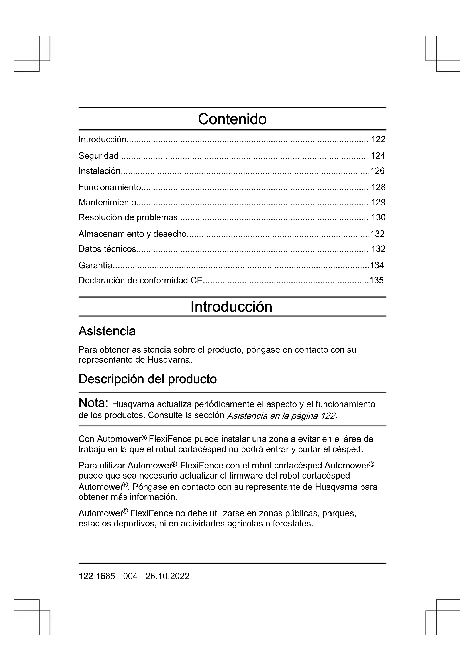 Estacas, uds. 100 Conectores, uds. 5 Garantía La garantía de Husqvarna cubre el funcionamiento de este producto durante un periodo de 2 años a partir de la fecha de compra. La garantía cubre defectos graves en los materiales o defectos de fábrica. Dentro del periodo de validez de la garantía, sustituiremos o repararemos el producto sin ningún cargo siempre que se cumplan las siguientes condiciones: 134 1685 - 004 - 26.10.2022• El producto solo se debe utilizar de acuerdo con las instrucciones incluidas en este manual de usuario. Esta garantía del fabricante no afecta a los derechos de garantía contra el distribuidor/minorista.