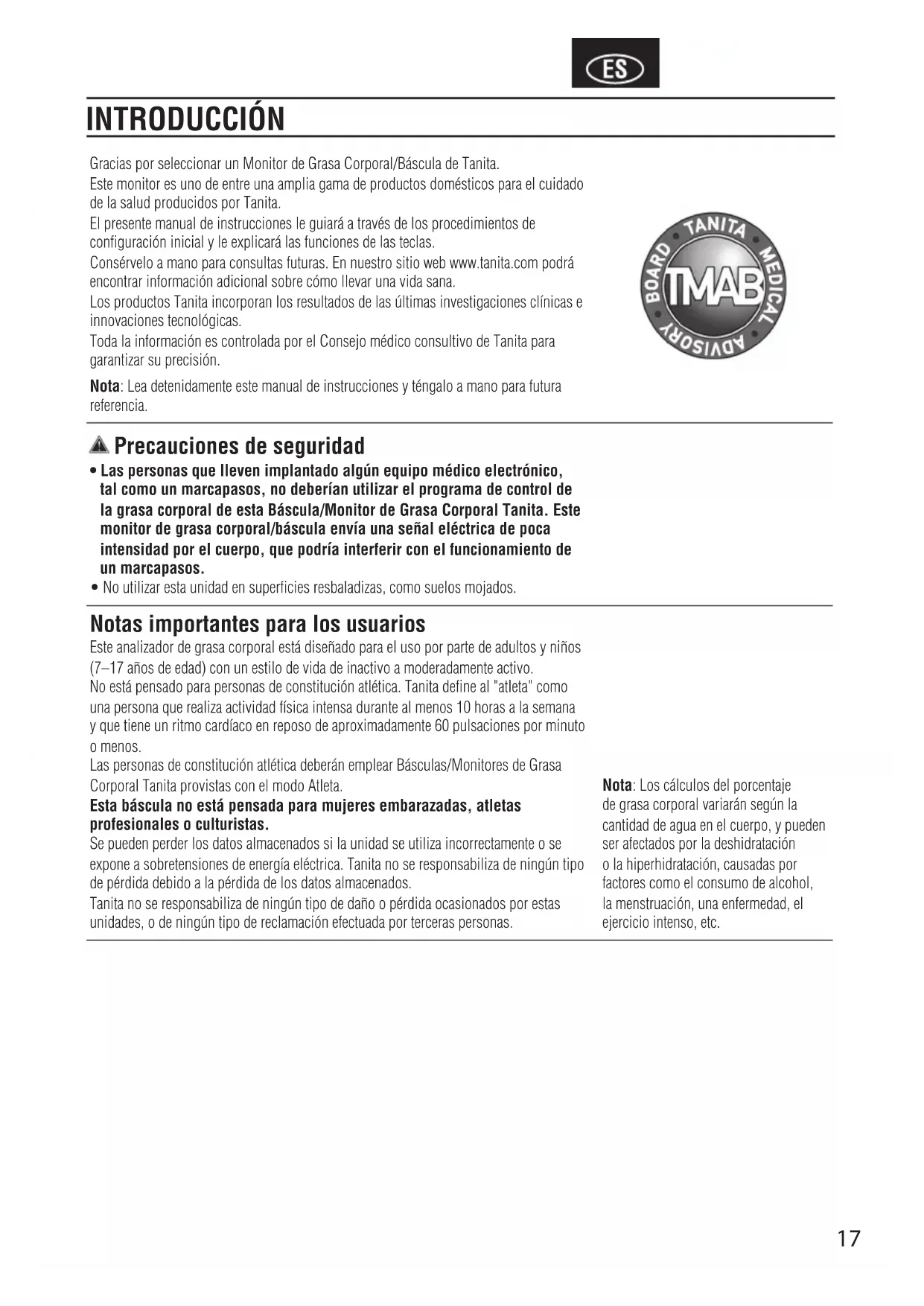 - Las personas que lleven implantado algún equipo médico electrónico, tal como un marcapasos, no deberían utilizar el programa de control de la grasa corporal de esta Báscula/Monitor de Grasa Corporal Tanita. Este monitor de grasa corporal/báscula envía una señal eléctrica de poca intensidad por el cuerpo, que podría interferir con el funcionamiento de un marcapasos.