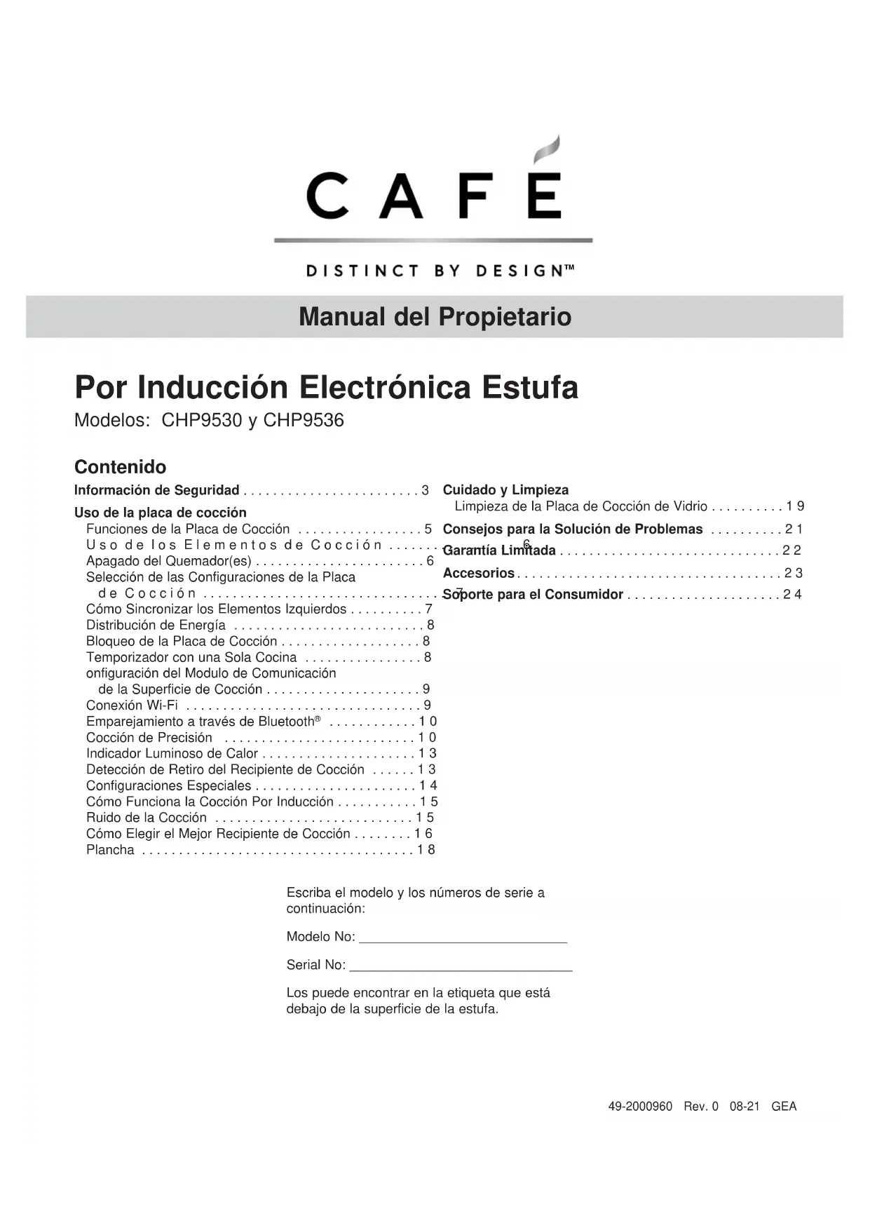 - Soporte para el Consumidor TM2 49-2000960 Rev. 0 GRACIAS POR HACER QUE CAFÉ SEA PARTE DE SU HOGAR. Sentimos orgullo por el nivel de arte, innovación y diseño de cada uno de los electrodomésticos de Café, y creemos que usted también. Entre otras cosas, el registro de su electrodoméstico asegura que podamos entregarle información importante del producto y detalles de la garantía cuando los necesite. Registre su electrodoméstico Café ahora a través de Internet. Sitios Web útiles están disponibles en la sección de Soporte para el Consumidor de este Manual del Propietario. También puede enviar una carta en la tarjeta de inscripción preimpresa que se incluye con el material embalado. TM49-2000960 Rev. 0 3 p. 24
