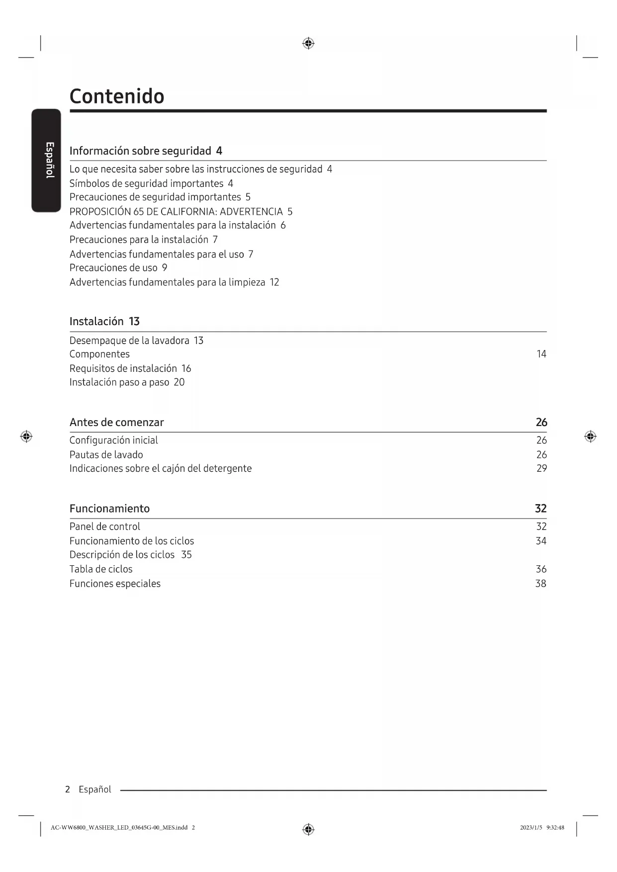 Advertencias fundamentales para la instalación 6 Precauciones para la instalación 7 Advertencias fundamentales para el uso 7 Precauciones de uso 9 Advertencias fundamentales para la limpieza 12 Instalación 13 Desempaque de la lavadora 13 Componentes 14 Requisitos de instalación 16 Instalación paso a paso 20 Antes de comenzar 26 Configuración inicial 26 Pautas de lavado 26 Indicaciones sobre el cajón del detergente 29 Funcionamiento 32 Panel de control 32 Funcionamiento de los ciclos 34 Descripción de los ciclos 35 Tabla de ciclos 36 Funciones especiales 38 AC-WW6800_WASHER_LED_03645G-00_MES.indd 2 2023/1/5 9:32:48Español Español
