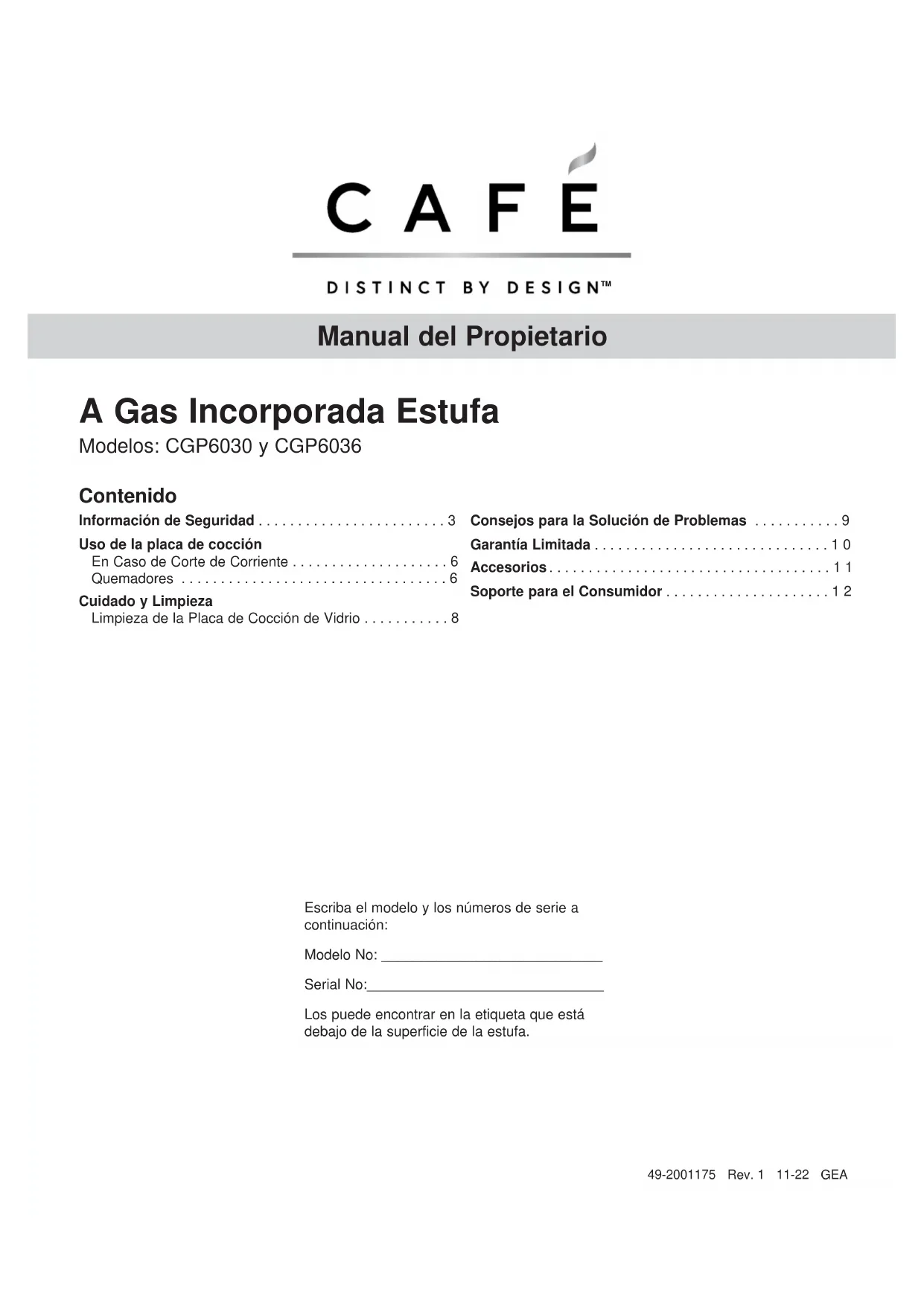 de agua y luego seque las mismas totalmente. Vuelva a colocar las cabezas de los quemadores en las ubicaciones correctas, de acuerdo con sus tamaños. Asegúrese de que cada tapa quede correctamente apoyada sobre la cabeza del quemador, como se muestra a continuación. PRECAUCIÓN No use la parte superior de la cocina sin que todas las partes de los quemadores y las parrillas estén en sus respectivos lugares. Cualquier derrame en o alrededor de un electrodo se deberá limpiar de forma cuidadosa. Evite golpear el electrodo con cualquier cosa dura, ya que podrá ser dañado. La tapa del quemador NO está correctamente colocada.La tapa del quemador NO está correctamente colocada.La tapa del quemador está correctamente colocada. El electrodo del encendedor de la chispa es expuesto cuando la cabeza del quemador es retirada. Cuando un quemador se gira a LITE, todos los quemadores hacen chispa. No intente desensamblar ni limpiar un quemador mientras otro quemador está encendido. Electrodo49-2001175 Rev. 1 9 CONSEJOS PARA LA SOLUCIÓN DE PROBLEMAS Problema Causas Posibles Qué Hacer Los quemadores poseen llamas amarillas y con puntas amarillasLa calidad de combustión de las llamas del quemador se deberá determinar visualmente.Determine la calidad de las llamas de forma visual. Las llamas QRUPDOHVGHORVTXHPDGRUHVVHGHEHUiQYHUFRPR$R%Las llamas largas de color amarillo brillante no son normales. Las llamas normales podrán mostrar signos de un tinte anaranjado cuando estén bien quemadas, o signos de anaranjado parpadeante debido a las partículas del gas o del aire.Las perillas de control no giran La perilla no es presionada hacia abajo. Para pasar desde la posición OFF (Apagado), presione la perilla hacia abajo y luego gire la misma.Los quemadores no se enciendenEl enchufe en la estufa no está completamente insertado en el tomacorriente eléctrico.Asegúrese de que el cable de electricidad esté enchufado en un tomacorriente correctamente conectado a tierra.El suministro de gas no fue conectado o encendido.Consulte las Instrucciones de Instalación provistas con su estufa.Es posible que un fusible de su hogar se haya quemado o que el disyuntor se haya desconectado.Reemplace el fusible o reinicie el disyuntor.Las piezas del quemador no fueron reemplazadas correctamente.Consulte la sección de Limpieza de la Superficie de Cocción.aLos electrodos debajo de los quemadores tienen suciedad.Consulte la sección de Limpieza de la Superficie de Cocción.La estufa está bloqueada. Desbloquee la estufa. Consulte la sección de Limpieza de la Superficie de Cocción.(ODJXMHURGHOHQFHQGHGRUHQDOJXQRVPRGHORVHVWiHQFKXIDGRLea la sección Cuidado y limpieza de la estufa.Un sonido de tic-tac del encendedor persiste una vez que el quemador está encendido.La perilla de control aún está en la SRVLFLyQ/,7((QFHQGHU Gire la perilla fuera de la posición LITE (Encender) hasta la configuración deseada.Apague el quemador y vuelva a encender el mismo. Si el sonido de tic-tac aún está presente, llame al servicio técnico.Los quemadores superiores no queman de forma parejaEnsamble del quemador inapropiado. Asegúrese de que las tapas del quemador estén instaladas correctamente. Lea la sección de Cuidado y Limpieza de la cocina.Las ranuras del quemador al costado del quemador se podrán atascar.Retire los quemadores para su limpieza. Lea la sección de Cuidado y Limpieza de la cocina.(A) Llamas azul suave —Normal para gas natural(B) Puntas amarillas en conos externos — Normal para el gas propano ¡Ahorre tiempo y dinero! Primero lea las tablas de las siguientes páginas y quizás no necesite llamar al servicio técnico. Consejos para la Solución de Problemas... Antes de solicitar el servicio técnico10 49-2001175 Rev. 1 Abroche su recibo aquí. Para acceder al servicio técnico de acuerdo con la garantía deberá contar con la prueba de la fecha original de compra. cafeappliances.com Todo el servicio de garantía es provisto por nuestros Centros de Servicio de Fabricación, o un técnico de servicio autorizado. Para programar una visita del servicio técnico a través de Internet, visítenos en cafeappliances.com/service. Tenga listo el número de serie y número de modelo cuando programe el servicio. Para realizar el servicio técnico de su electrodoméstico, se podrá requerir el uso de datos del puerto de abordaje para su diagnóstico. Esto da al técnico del servicio de fábrica de Café la habilidad de diagnosticar de forma rápida cualquier problema con su electrodoméstico, y de ayudar a Café a mejorar sus productos al brindarle a Café la información sobre su electrodoméstico. Si no desea que los datos de su electrodoméstico sean enviados a Café, solicitamos que le indique a su técnico no entregar los datos a Café en el momento del servicio. Qué no cubrirá Café: Ŷ 9LDMHVGHOWpFQLFRGHOVHUYLFLRDVXKRJDUSDUDHQVHxDUOH sobre cómo usar el producto. Ŷ ,QVWDODFLyQHQWUHJDRPDQWHQLPLHQWRLQDGHFXDGRV Ŷ )DOODVGHOSURGXFWRHQFDVRGHDEXVRPDOXVRPRGLILFDFLyQ o uso para propósitos diferentes al original o uso comercial. Ŷ 'DxRVVREUHODVXSHUILFLHGHFRFFLyQGHYLGULRTXHVHDQ ocasionados por el uso de limpiadores que no sean las cremas de limpieza o almohadillas recomendadas. Ŷ 'DxRVVREUHODVXSHUILFLHGHFRFFLyQGHYLGULRRFDVLRQDGRV por derrames habituales de materiales azucarados o plásticos derretidos que no se limpien de acuerdo con las instrucciones que figuran en el Manual del Propietario.