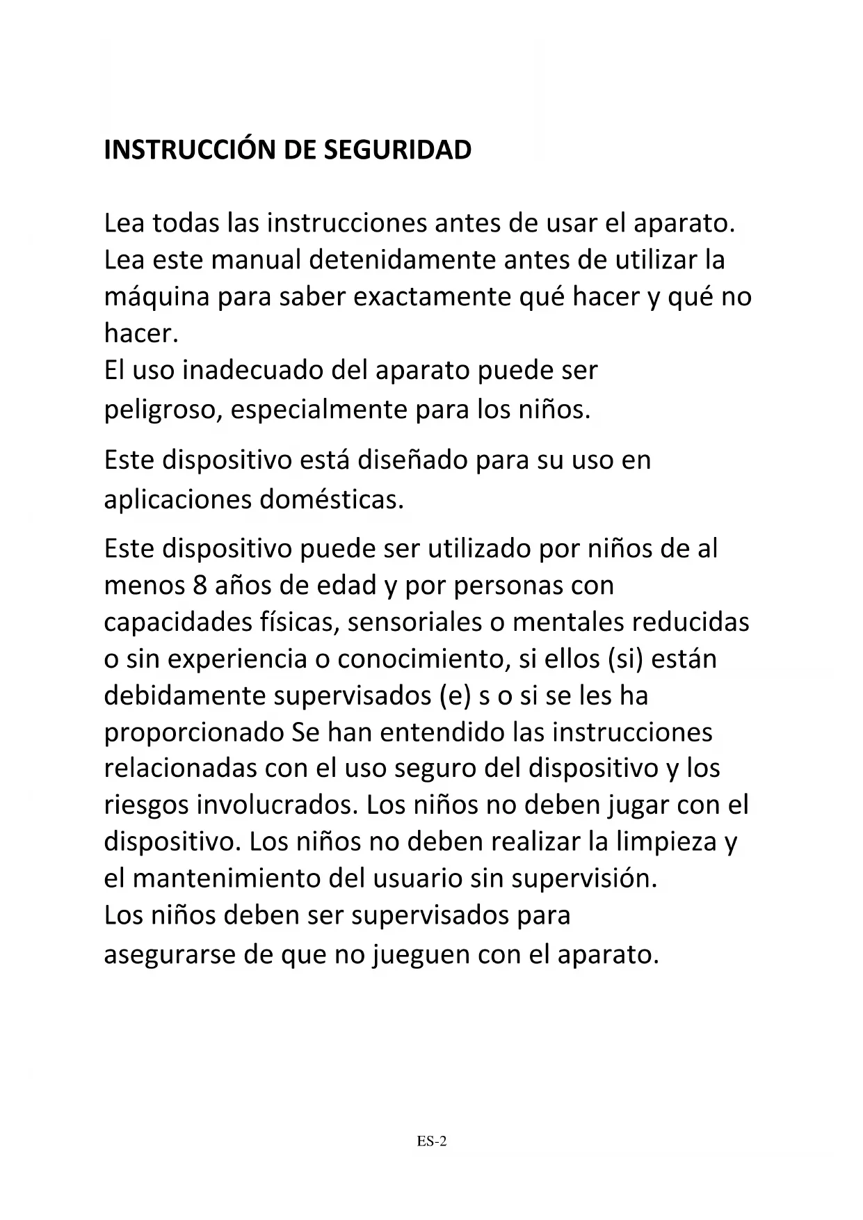 Lea todas las instrucciones antes de usar el aparato. Lea este manual detenidamente antes de utilizar la máquina para saber exactamente qué hacer y qué no hacer. El uso inadecuado del aparato puede ser peligroso, especialmente para los niños. Este dispositivo está diseñado para su uso en aplicaciones domésticas. Este dispositivo puede ser utilizado por niños de al menos 8 años de edad y por personas con capacidades físicas, sensoriales o mentales reducidas o sin experiencia o conocimiento, si ellos (si) están debidamente supervisados (e) s o si se les ha proporcionado Se han entendido las instrucciones relacionadas con el uso seguro del dispositivo y los riesgos involucrados. Los niños no deben jugar con el dispositivo. Los niños no deben realizar la limpieza y el mantenimiento del usuario sin supervisión. Los niños deben ser supervisados para asegurarse de que no jueguen con el aparato.ES-3