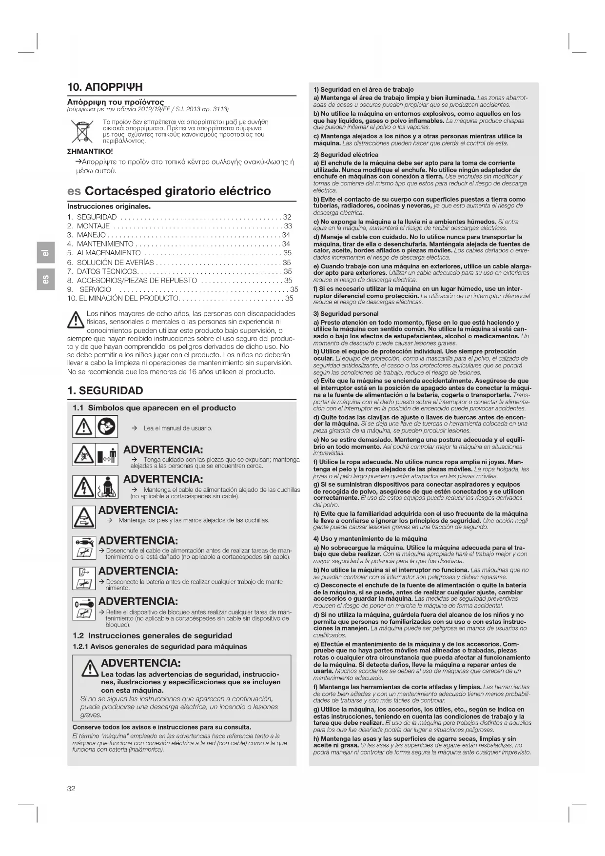 el1) Seguridad en el área de trabajoa) Mantenga el área de trabajo limpia y bien iluminada. Las zonas abarrot-adas de cosas u oscuras pueden propiciar que se produzcan accidentes.b) No utilice la máquina en entornos explosivos, como aquellos en los que hay líquidos, gases o polvo inamables. La máquina produce chispas que pueden inamar el polvo o los vapores.c) Mantenga alejados a los niños y a otras personas mientras utilice la máquina. Las distracciones pueden hacer que pierda el control de esta.2) Seguridad eléctricaa) El enchufe de la máquina debe ser apto para la toma de corriente utilizada. Nunca modique el enchufe. No utilice ningún adaptador de enchufe en máquinas con conexión a tierra. Use enchufes sin modicar y tomas de corriente del mismo tipo que estos para reducir el riesgo de descarga eléctrica.b) Evite el contacto de su cuerpo con supercies puestas a tierra como tuberías, radiadores, cocinas y neveras, ya que esto aumenta el riesgo de descarga eléctrica.c) No exponga la máquina a la lluvia ni a ambientes húmedos. Si entra agua en la máquina, aumentará el riesgo de recibir descargas eléctricas.d) Maneje el cable con cuidado. No lo utilice nunca para transportar la máquina, tirar de ella o desenchufarla. Manténgala alejada de fuentes de calor, aceite, bordes alados o piezas móviles. Los cables dañados o enre-dados incrementan el riesgo de descarga eléctrica.e) Cuando trabaje con una máquina en exteriores, utilice un cable alarga-dor apto para exteriores. Utilizar un cable adecuado para su uso en exteriores reduce el riesgo de descarga eléctrica.f) Si es necesario utilizar la máquina en un lugar húmedo, use un inter-ruptor diferencial como protección. La utilización de un interruptor diferencial reduce el riesgo de descargas eléctricas.3) Seguridad personala) Preste atención en todo momento, fíjese en lo que está haciendo y utilice la máquina con sentido común. No utilice la máquina si está can-sado o bajo los efectos de estupefacientes, alcohol o medicamentos. Un momento de descuido puede causar lesiones graves.b) Utilice el equipo de protección individual. Use siempre protección ocular. El equipo de protección, como la mascarilla para el polvo, el calzado de seguridad antideslizante, el casco o los protectores auriculares que se pondrá según las condiciones de trabajo, reduce el riesgo de lesiones.c) Evite que la máquina se encienda accidentalmente. Asegúrese de que el interruptor está en la posición de apagado antes de conectar la máqui-na a la fuente de alimentación o la batería, cogerla o transportarla. Trans-portar la máquina con el dedo puesto sobre el interruptor o conectar la alimenta-ción con el interruptor en la posición de encendido puede provocar accidentes.d) Quite todas las clavijas de ajuste o llaves de tuercas antes de encen-der la máquina. Si se deja una llave de tuercas o herramienta colocada en una pieza giratoria de la máquina, se pueden producir lesiones.e) No se estire demasiado. Mantenga una postura adecuada y el equili-brio en todo momento. Así podrá controlar mejor la máquina en situaciones imprevistas.f) Utilice la ropa adecuada. No utilice nunca ropa amplia ni joyas. Man-tenga el pelo y la ropa alejados de las piezas móviles. La ropa holgada, las joyas o el pelo largo pueden quedar atrapados en las piezas móviles.g) Si se suministran dispositivos para conectar aspiradores y equipos de recogida de polvo, asegúrese de que estén conectados y se utilicen correctamente. El uso de estos equipos puede reducir los riesgos derivados del polvo.h) Evite que la familiaridad adquirida con el uso frecuente de la máquina le lleve a conarse e ignorar los principios de seguridad. Una acción negli-gente puede causar lesiones graves en una fracción de segundo.4) Uso y mantenimiento de la máquinaa) No sobrecargue la máquina. Utilice la máquina adecuada para el tra-bajo que deba realizar. Con la máquina apropiada hará el trabajo mejor y con mayor seguridad a la potencia para la que fue diseñada.b) No utilice la máquina si el interruptor no funciona. Las máquinas que no se puedan controlar con el interruptor son peligrosas y deben repararse.c) Desconecte el enchufe de la fuente de alimentación o quite la batería de la máquina, si se puede, antes de realizar cualquier ajuste, cambiar accesorios o guardar la máquina. Las medidas de seguridad preventivas reducen el riesgo de poner en marcha la máquina de forma accidental.d) Si no utiliza la máquina, guárdela fuera del alcance de los niños y no permita que personas no familiarizadas con su uso o con estas instruc-ciones la manejen. La máquina puede ser peligrosa en manos de usuarios no cualicados.e) Efectúe el mantenimiento de la máquina y de los accesorios. Com-pruebe que no haya partes móviles mal alineadas o trabadas, piezas rotas o cualquier otra circunstancia que pueda afectar al funcionamiento de la máquina. Si detecta daños, lleve la máquina a reparar antes de usarla. Muchos accidentes se deben al uso de máquinas que carecen de un mantenimiento adecuado.f) Mantenga las herramientas de corte aladas y limpias. Las herramientas de corte bien aladas y con un mantenimiento adecuado tienen menos probabili-dades de trabarse y son más fáciles de controlar.g) Utilice la máquina, los accesorios, los útiles, etc., según se indica en estas instrucciones, teniendo en cuenta las condiciones de trabajo y la tarea que debe realizar. El uso de la máquina para trabajos distintos a aquellos para los que fue diseñada podría dar lugar a situaciones peligrosas.h) Mantenga las asas y las supercies de agarre secas, limpias y sin aceite ni grasa. Si las asas y las supercies de agarre están resbaladizas, no podrá manejar ni controlar de forma segura la máquina ante cualquier imprevisto. es Cortacésped giratorio eléctrico Instrucciones originales. Los niños mayores de ocho años, las personas con discapacidades físicas, sensoriales o mentale