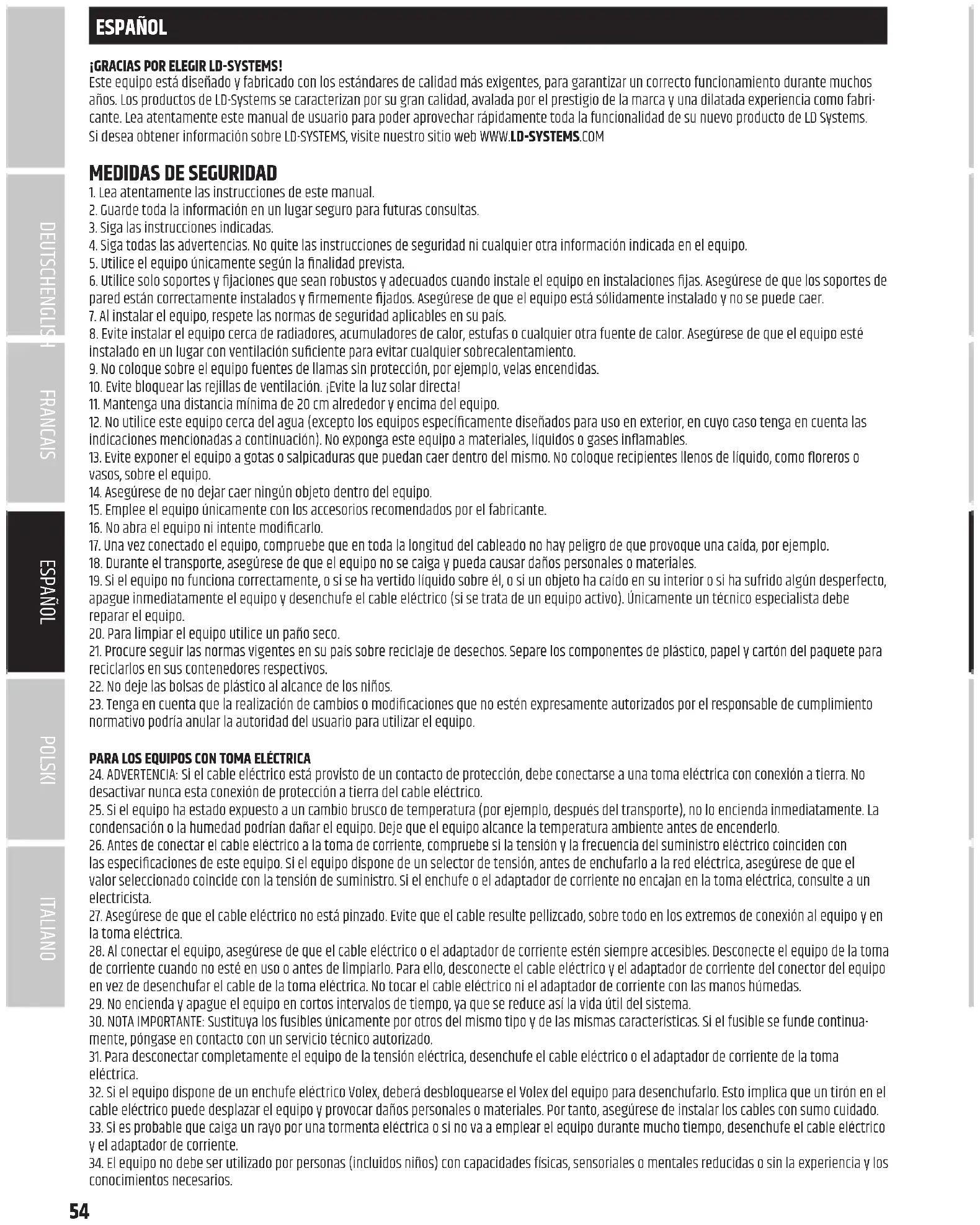 ¡GRACIAS POR ELEGIR LD-SYSTEMS! Este equipo está diseñado y fabricado con los estándares de calidad más exigentes, para garantizar un correcto funcionamiento durante muchos años. Los productos de LD-Systems se caracterizan por su gran calidad, avalada por el prestigio de la marca y una dilatada experiencia como fabri- cante. Lea atentamente este manual de usuario para poder aprovechar rápidamente toda la funcionalidad de su nuevo producto de LD Systems. Si desea obtener información sobre LD-SYSTEMS, visite nuestro sitio web WWW.LD-SYSTEMS.COM