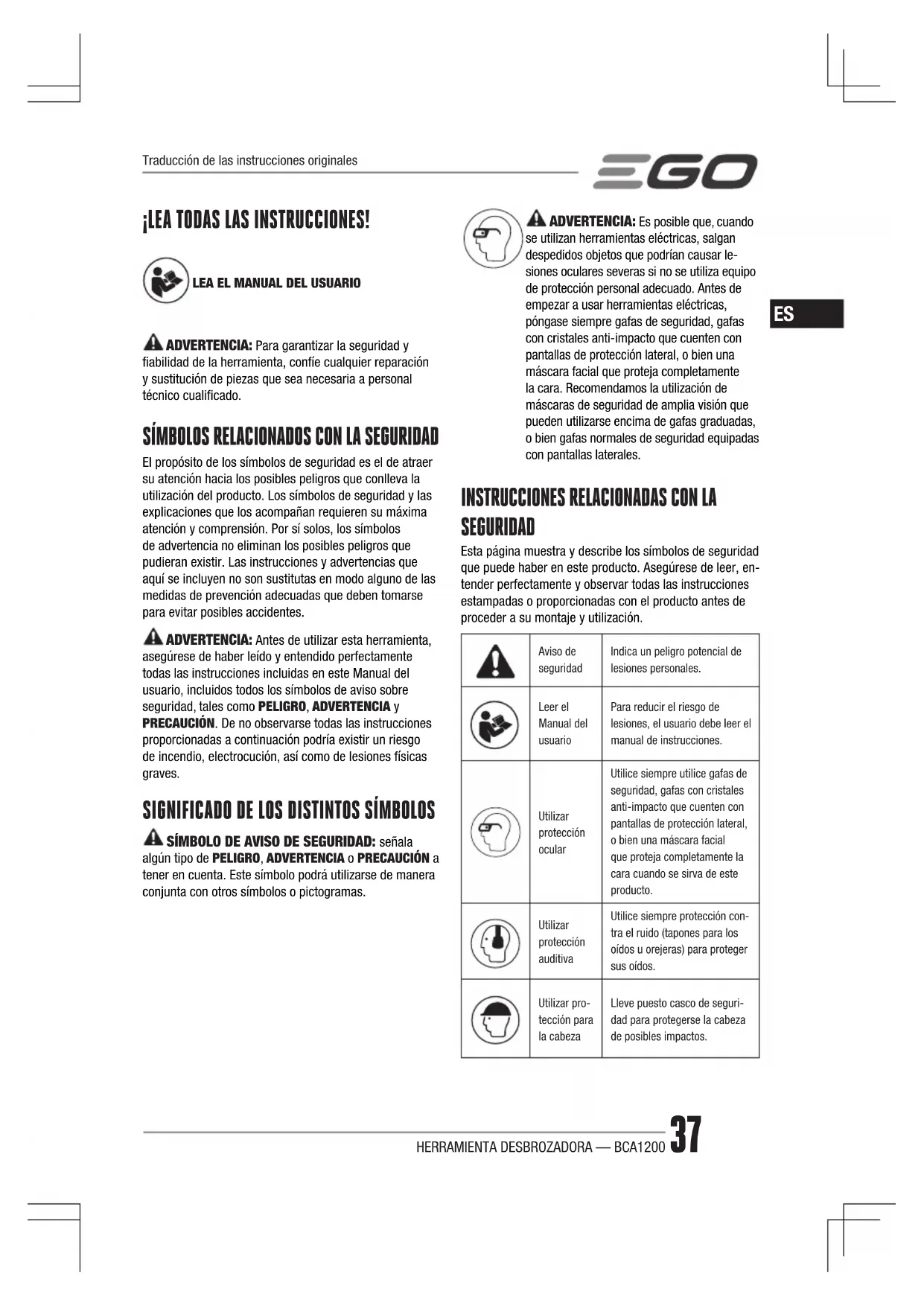 SEGURIDAD Esta página muestra y describe los símbolos de seguridad que puede haber en este producto. Asegúrese de leer, en- tender perfectamente y observar todas las instrucciones estampadas o proporcionadas con el producto antes de proceder a su montaje y utilización. Aviso de seguridadIndica un peligro potencial de lesiones personales.Leer el Manual del usuarioPara reducir el riesgo de lesiones, el usuario debe leer el manual de instrucciones.Utilizar protección ocularUtilice siempre utilice gafas de seguridad, gafas con cristales anti-impacto que cuenten con pantallas de protección lateral, o bien una máscara facial que proteja completamente la cara cuando se sirva de este producto.Utilizar protección auditivaUtilice siempre protección con-tra el ruido (tapones para los oídos u orejeras) para proteger sus oídos.Utilizar pro-tección para la cabezaLleve puesto casco de seguri-dad para protegerse la cabeza de posibles impactos. Traducción de las instrucciones originalesHERRAMIENTA DESBROZADORA — BCA120038