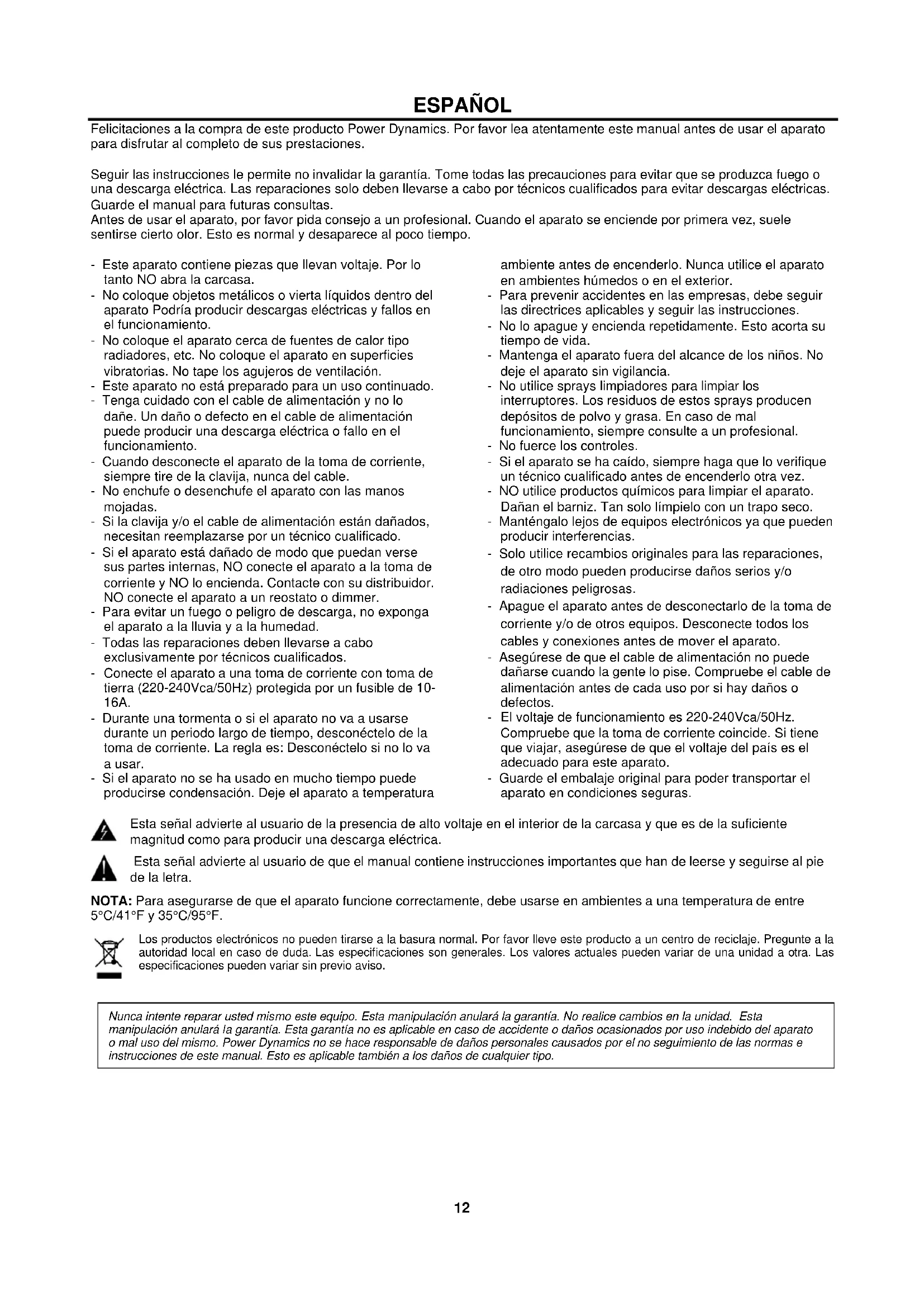- Zusätzlich zu den Kanal- und MASTER-Lautstärkereglern gibt es BASS- und TREBLE-EQ-Regler, um den Ton des Gesamtausgangs einzustellen. Bei der 12-Uhr-Position wenden diese Bedienelemente keine Auswirkung auf das Signal (kein Boost oder Cut). Das Bewegen des BASS-Reglers im Uhrzeigersinn erhöht die tiefen Frequenzen im Audio, während es im Gegenuhrzeigersinn die niedrigen Frequenzen schaltet. Ebenso erhöht das Bewegen des TREBLE-Reglers im Uhrzeigersinn die hohen Frequenzen im Audio, während er im Gegenuhrzeigersinn die hohen Frequenzen schneidet. Passen Sie diese EQ-Regler an die Art des Audiosignals an oder kompensieren Sie die Raumakustik. SICHERUNGSWECHSEL Wenn die Feinsicherung des Gerätes defekt ist, darf diese nur durch eine Sicherung gleichen Typs ersetzt werden. Vor dem Sicherungswechsel ist das Gerät allpolig von der Netzspannung zu trennen (Netzsteckerziehen). Vorgehensweise: Schritt 1: Öffnen Sie den Sicherungshalter an der Geräterückseite mit einem passenden Schraubendreher. Schritt 2: Entfernen Sie die defekte Sicherung aus dem Sicherungshalter. Schritt 3: Setzen Sie die neue Sicherung in den Sicherungshalter ein. Schritt 4: Setzen Sie den Sicherungshalter wieder im Gehäuse ein.12 ESPAÑOL Felicitaciones a la compra de este producto Power Dynamics. Por favor lea atentamente este manual antes de usar el aparato para disfrutar al completo de sus prestaciones. Seguir las instrucciones le permite no invalidar la garantía. Tome todas las precauciones para evitar que se produzca fuego o una descarga eléctrica. Las reparaciones solo deben llevarse a cabo por técnicos cualificados para evitar descargas eléctricas. Guarde el manual para futuras consultas. Antes de usar el aparato, por favor pida consejo a un profesional. Cuando el aparato se enciende por primera vez, suele sentirse cierto olor. Esto es normal y desaparece al poco tiempo. - Este aparato contiene piezas que llevan voltaje. Por lo tanto NO abra la carcasa. - No coloque objetos metálicos o vierta líquidos dentro del aparato Podría producir descargas eléctricas y fallos en el funcionamiento. - No coloque el aparato cerca de fuentes de calor tipo radiadores, etc. No coloque el aparato en superficies vibratorias. No tape los agujeros de ventilación. - Este aparato no está preparado para un uso continuado. - Tenga cuidado con el cable de alimentación y no lo dañe. Un daño o defecto en el cable de alimentación puede producir una descarga eléctrica o fallo en el funcionamiento. - Cuando desconecte el aparato de la toma de corriente, siempre tire de la clavija, nunca del cable. - No enchufe o desenchufe el aparato con las manos mojadas. - Si la clavija y/o el cable de alimentación están dañados, necesitan reemplazarse por un técnico cualificado. - Si el aparato está dañado de modo que puedan verse sus partes internas, NO conecte el aparato a la toma de corriente y NO lo encienda. Contacte con su distribuidor. NO conecte el aparato a un reostato o dimmer. - Para evitar un fuego o peligro de descarga, no exponga el aparato a la lluvia y a la humedad. - Todas las reparaciones deben llevarse a cabo exclusivamente por técnicos cualificados. - Conecte el aparato a una toma de corriente con toma de tierra (220-240Vca/50Hz) protegida por un fusible de 10- 16A. - Durante una tormenta o si el aparato no va a usarse durante un periodo largo de tiempo, desconéctelo de la toma de corriente. La regla es: Desconéctelo si no lo va a usar. - Si el aparato no se ha usado en mucho tiempo puede producirse condensación. Deje el aparato a temperatura ambiente antes de encenderlo. Nunca utilice el aparato en ambientes húmedos o en el exterior. - Para prevenir accidentes en las empresas, debe seguir las directrices aplicables y seguir las instrucciones. - No lo apague y encienda repetidamente. Esto acorta su tiempo de vida. - Mantenga el aparato fuera del alcance de los niños. No deje el aparato sin vigilancia. - No utilice sprays limpiadores para limpiar los interruptores. Los residuos de estos sprays producen depósitos de polvo y grasa. En caso de mal funcionamiento, siempre consulte a un profesional. - No fuerce los controles. - Si el aparato se ha caído, siempre haga que lo verifique un técnico cualificado antes de encenderlo otra vez. - NO utilice productos químicos para limpiar el aparato. Dañan el barniz. Tan solo límpielo con un trapo seco. - Manténgalo lejos de equipos electrónicos ya que pueden producir interferencias. - Solo utilice recambios originales para las reparaciones, de otro modo pueden producirse daños serios y/o radiaciones peligrosas. - Apague el aparato antes de desconectarlo de la toma de corriente y/o de otros equipos. Desconecte todos los cables y conexiones antes de mover el aparato. - Asegúrese de que el cable de alimentación no puede dañarse cuando la gente lo pise. Compruebe el cable de alimentación antes de cada uso por si hay daños o defectos. - El voltaje de funcionamiento es 220-240Vca/50Hz. Compruebe que la toma de corriente coincide. Si tiene que viajar, asegúrese de que el voltaje del país es el adecuado para este aparato. - Guarde el embalaje original para poder transportar el aparato en condiciones seguras. Esta señal advierte al usuario de la presencia de alto voltaje en el interior de la carcasa y que es de la suficiente magnitud como para producir una descarga eléctrica. Esta señal advierte al usuario de que el manual contiene instrucciones importantes que han de leerse y seguirse al pie de la letra. NOTA: Para asegurarse de que el aparato funcione correctamente, debe usarse en ambientes a una temperatura de entre 5°C/41°F y 35°C/95°F. Los productos electrónicos no pueden tirarse a la basura normal. Por favor lleve este producto a un centro de reciclaje. Pregunte a la autoridad local en caso de duda. Las especificaciones son generales. Los valores actuales pueden variar de una unidad a otra. Las especificaciones pueden variar sin previo aviso.