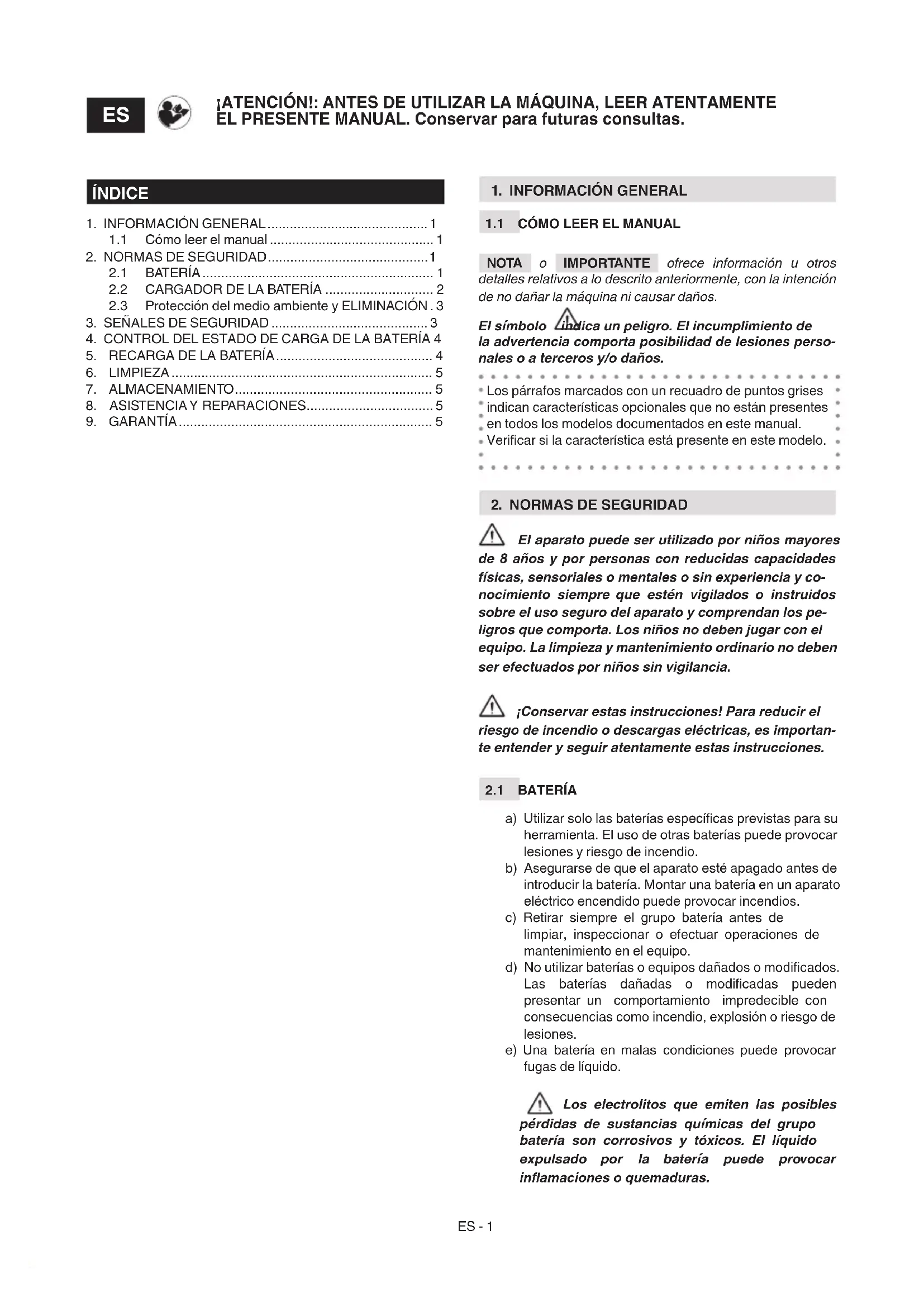 a) Utilizar solo las baterías especícas previstas para su herramienta. El uso de otras baterías puede provocar lesiones y riesgo de incendio. b) Asegurarse de que el aparato esté apagado antes de introducir la batería. Montar una batería en un aparato eléctrico encendido puede provocar incendios. c) Retirar siempre el grupo batería antes de limpiar, inspeccionar o efectuar operaciones de mantenimiento en el equipo. d) No utilizar baterías o equipos dañados o modicados. Las baterías dañadas o modicadas pueden presentar un comportamiento impredecible con consecuencias como incendio, explosión o riesgo de lesiones. e) Una batería en malas condiciones puede provocar fugas de líquido. Los electrolitos que emiten las posibles pérdidas de sustancias químicas del grupo batería son corrosivos y tóxicos. El líquido expulsado por la batería puede provocar inamaciones o quemaduras. ¡ATENCIÓN!: ANTES DE UTILIZAR LA MÁQUINA, LEER ATENTAMENTE EL PRESENTE MANUAL. Conservar para futuras consultas.